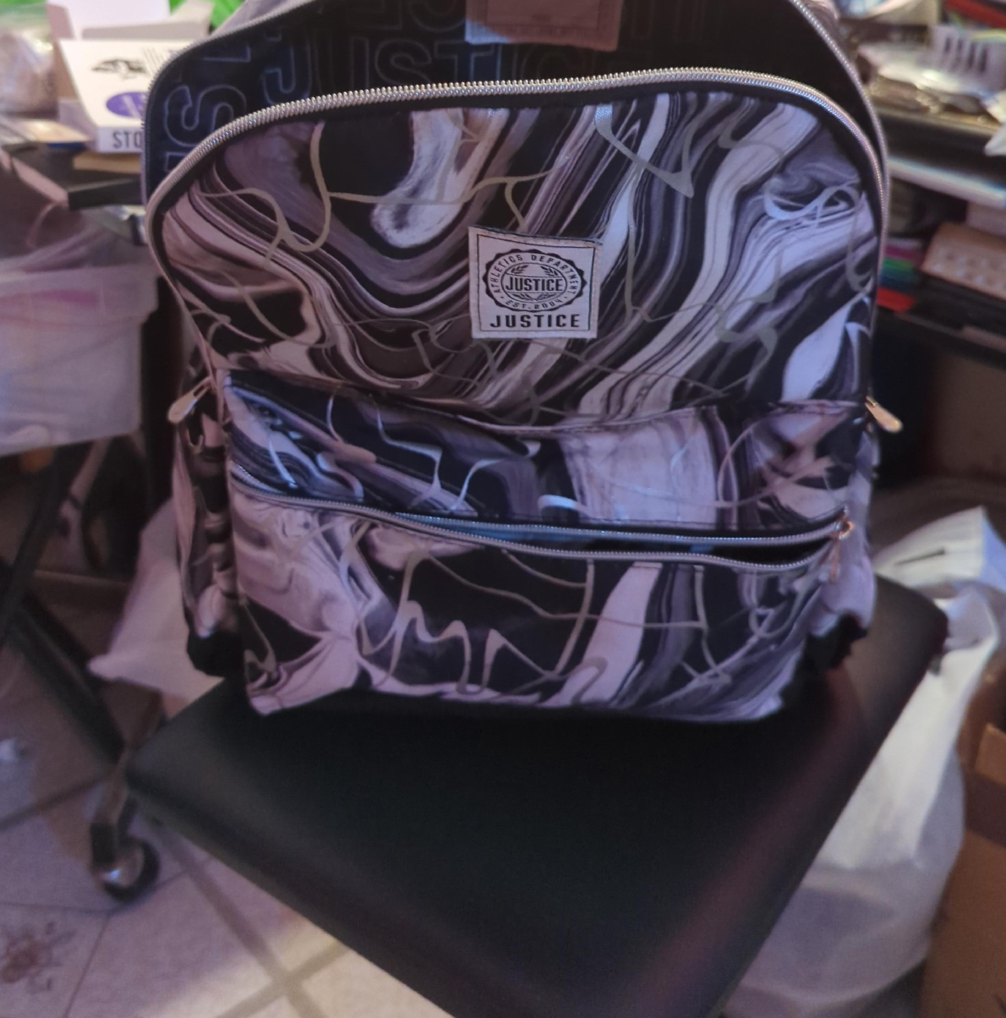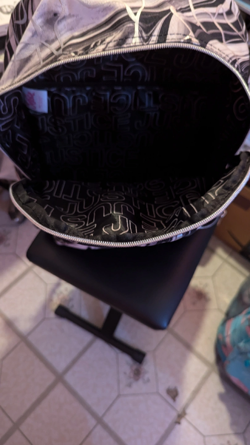 Selling a Justice backpack! It's in great condition and ready for a new owner. The backpack features a stylish black and white marbled pattern. Perfect for school, travel, or everyday use!