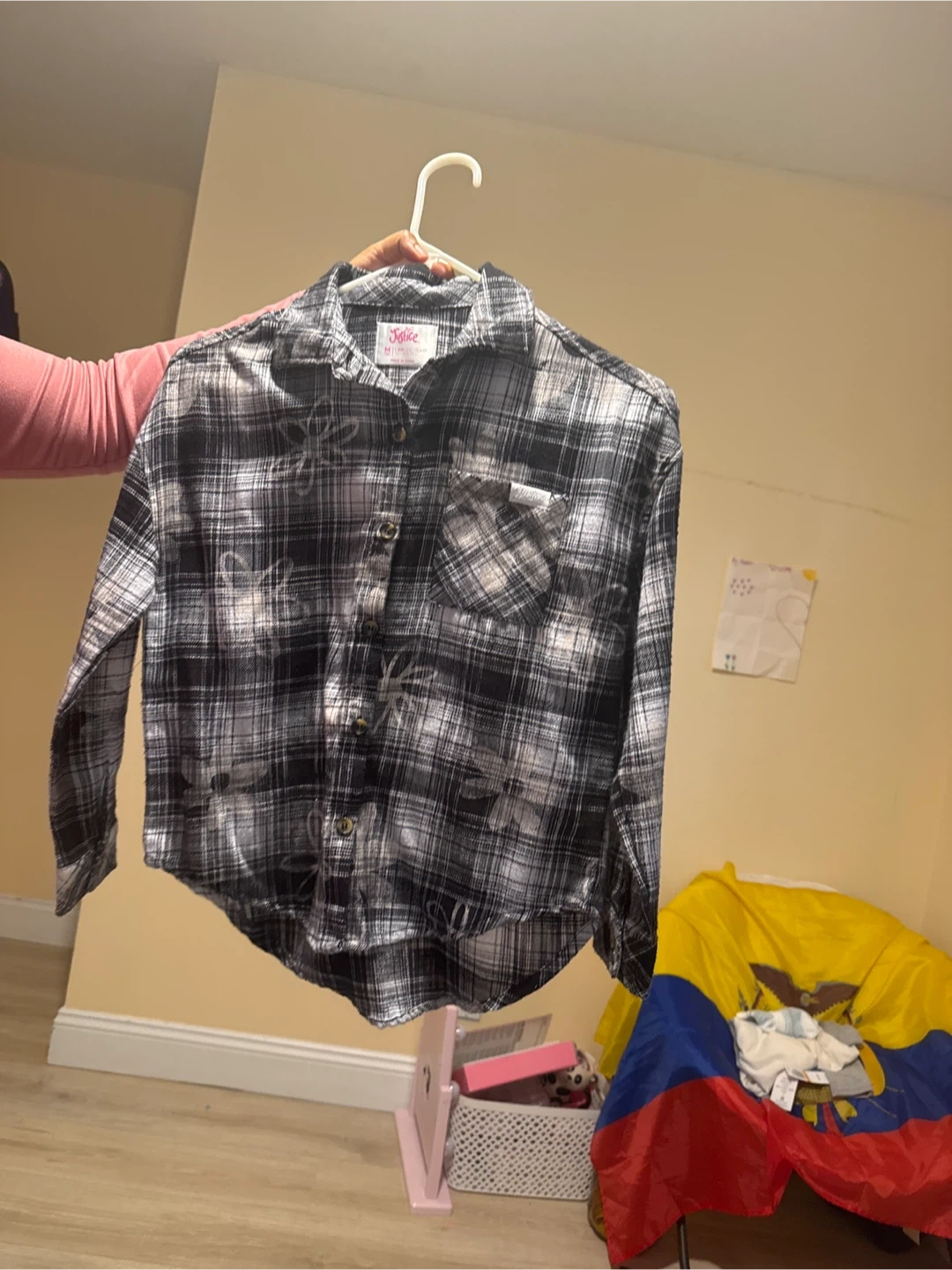 25Selling a cute Justice flannel shirt for girls in size 10. It features a classic plaid pattern in black and white. Perfect for layering or wearing on its own!