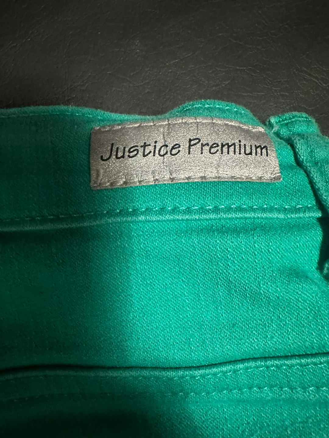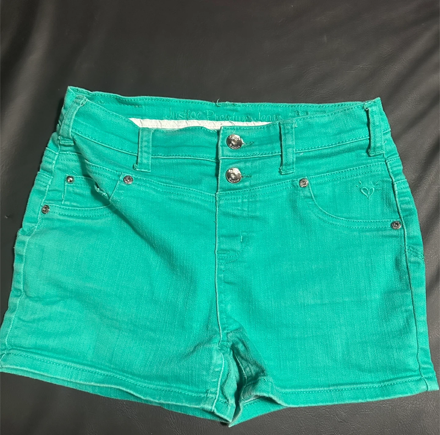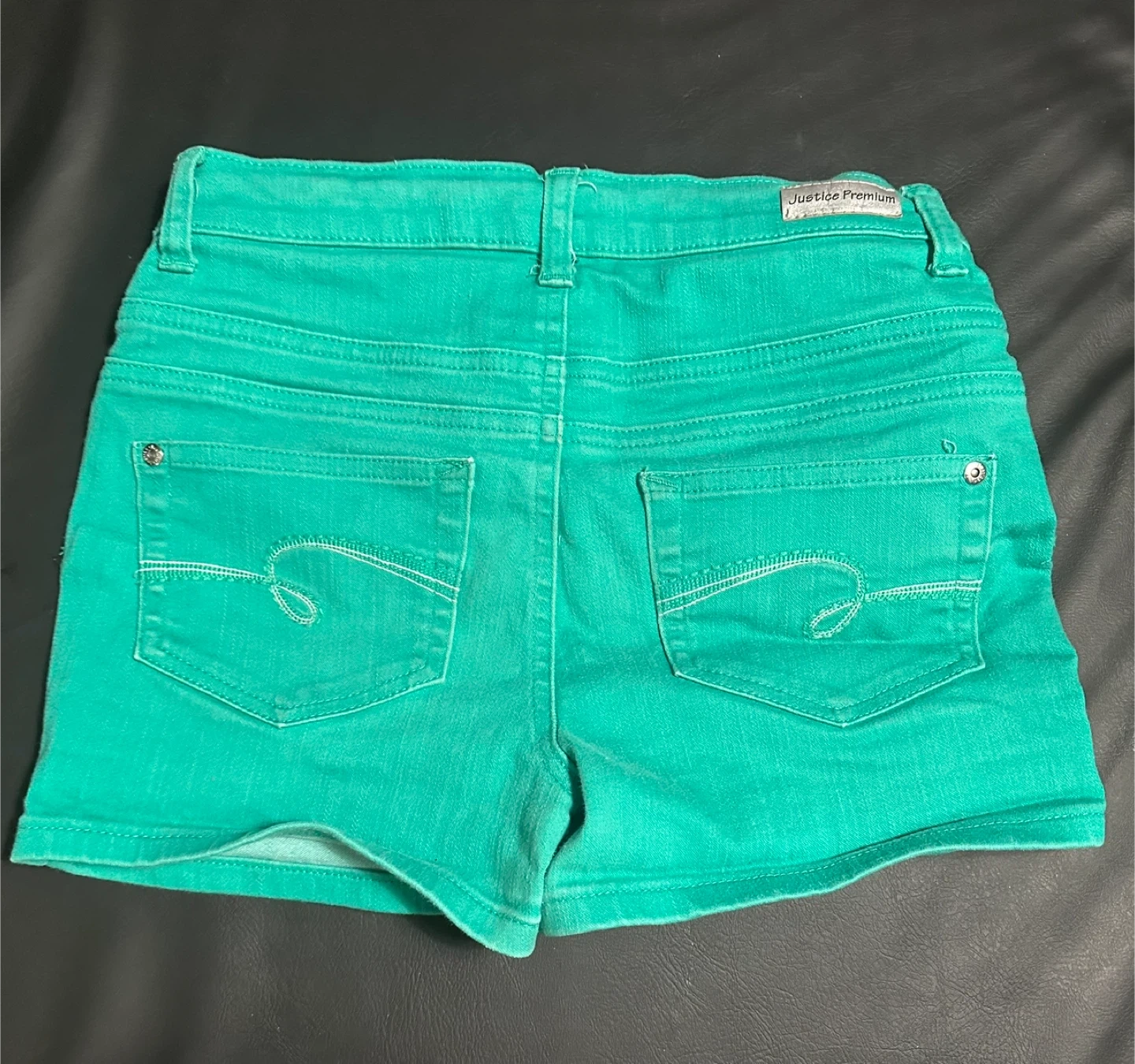75These are a pair of Justice Premium denim shorts in a vibrant green color. They appear are in great condition and feature a classic denim design with pockets and a button closure. Perfect for casual wear! Size 16 girls