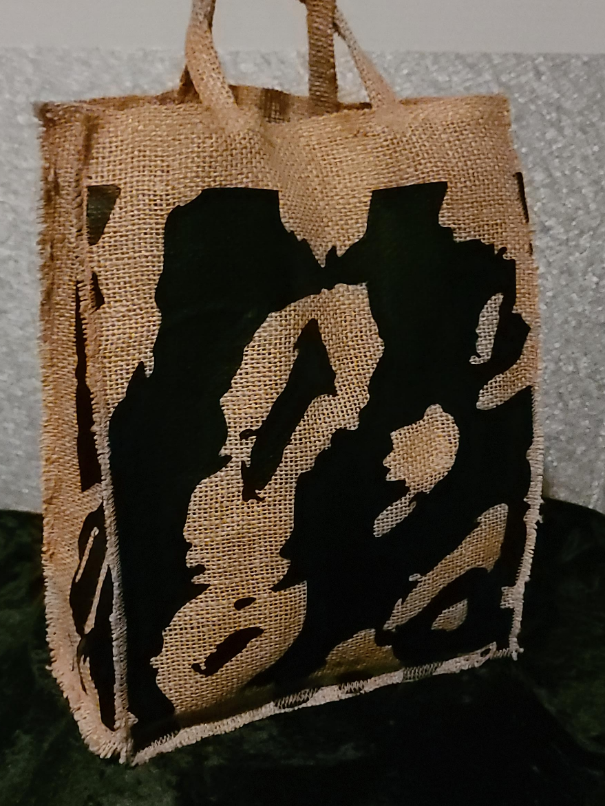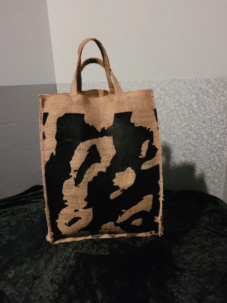 This is a jute tote bag featuring a unique black design! It's perfect for carrying your keys, book, phone, tablet or anything else you need on the go. The bag is made of durable jute material and has sturdy handles for comfortable carrying