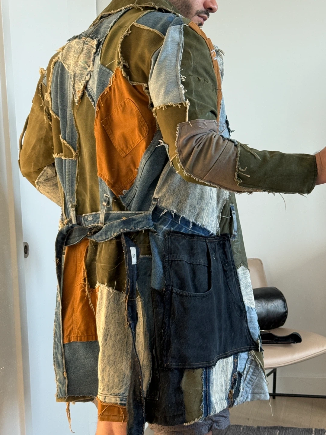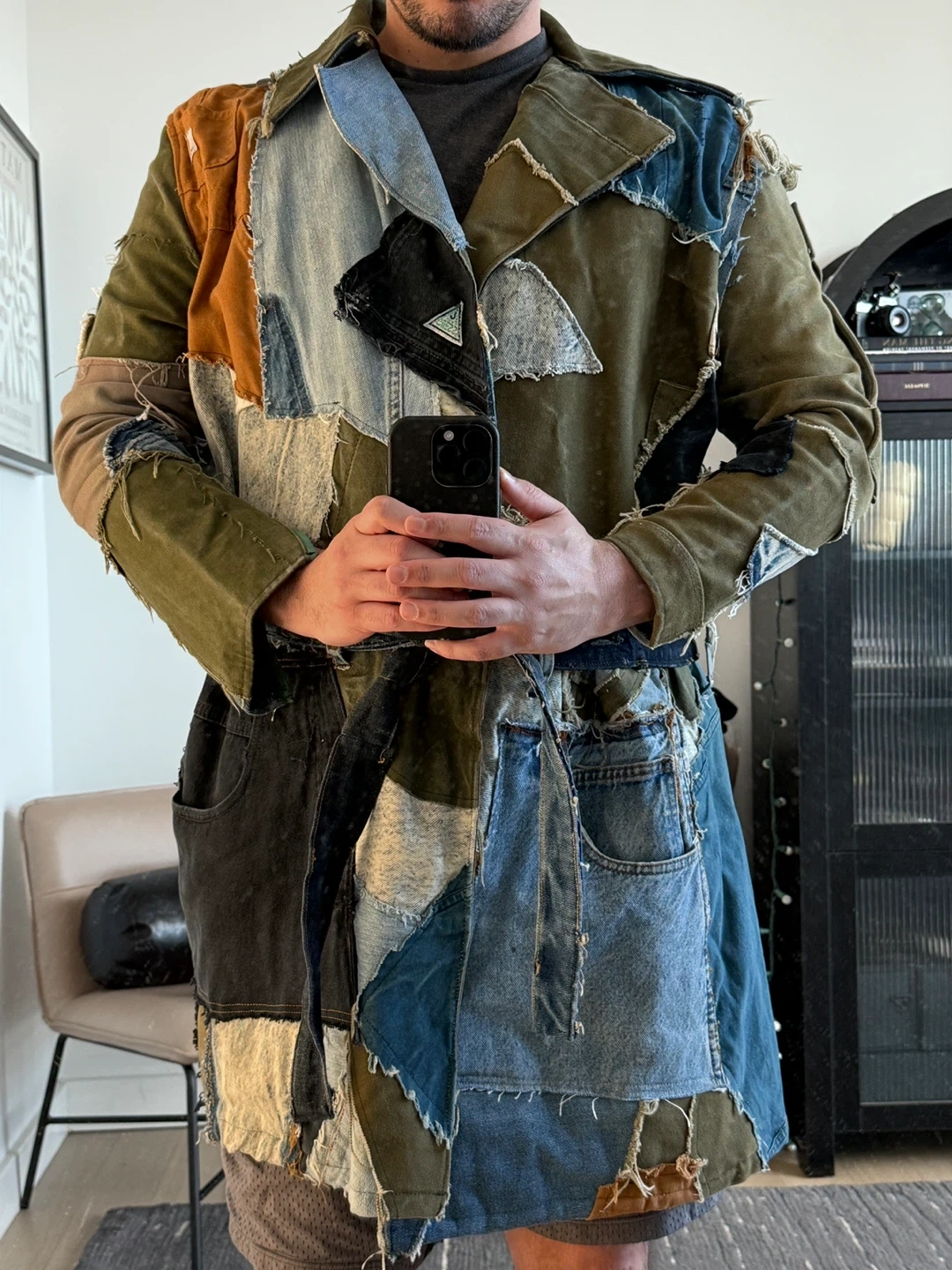One-of-a-kind patchwork denim trench coat featuring a variety of denim washes and colors. This eye-catching coat is sure to make a statement!