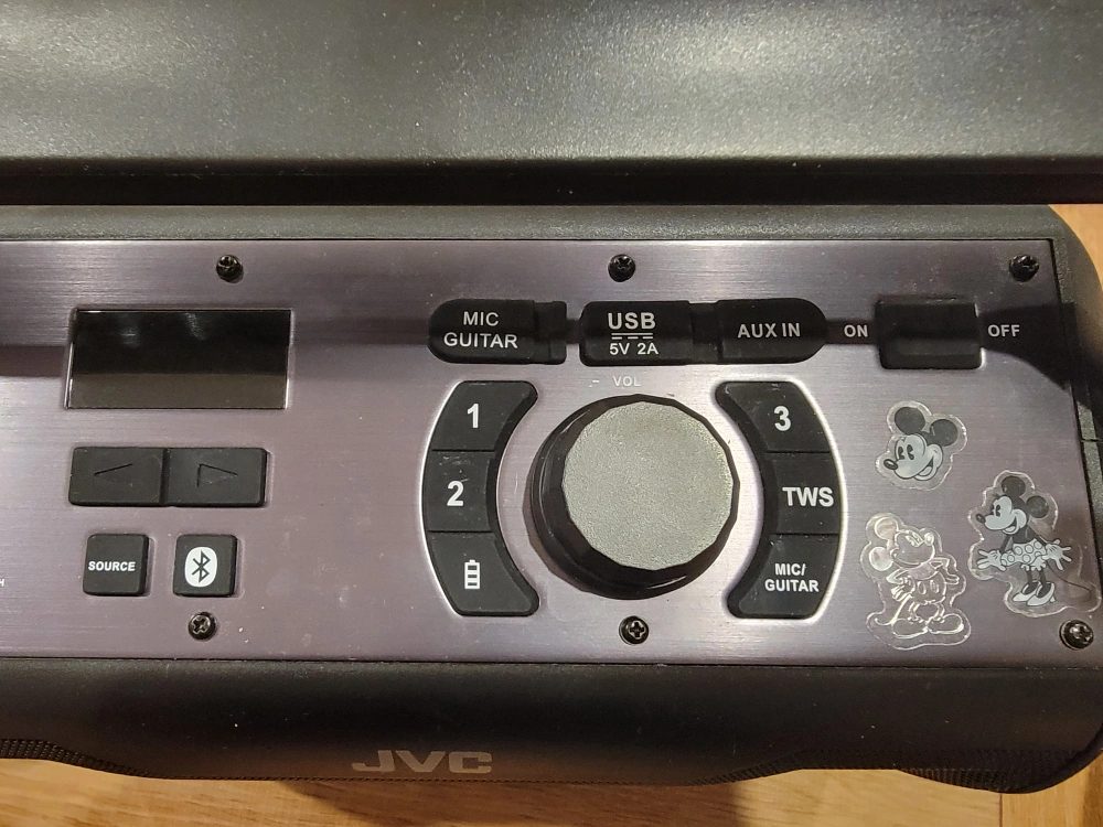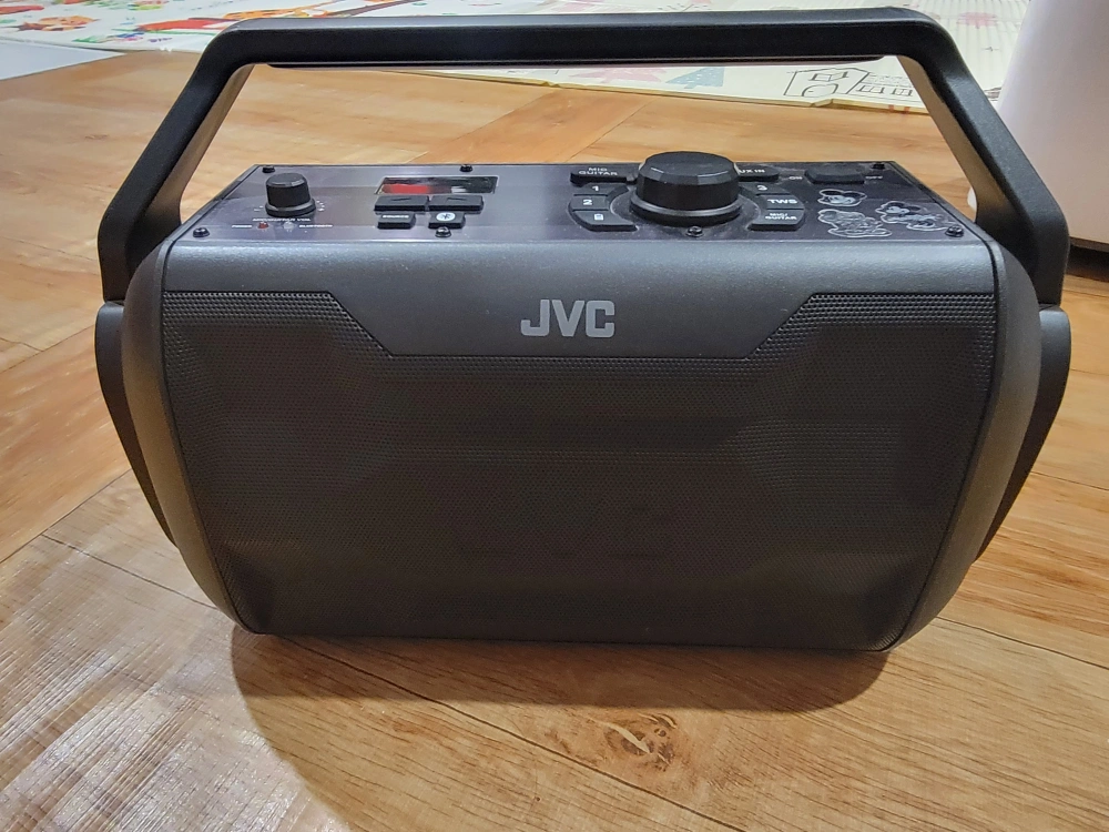 48Portable Bluetooth speaker with microphone and guitar inputs. Has USB and AUX input, and comes with a carrying handle.