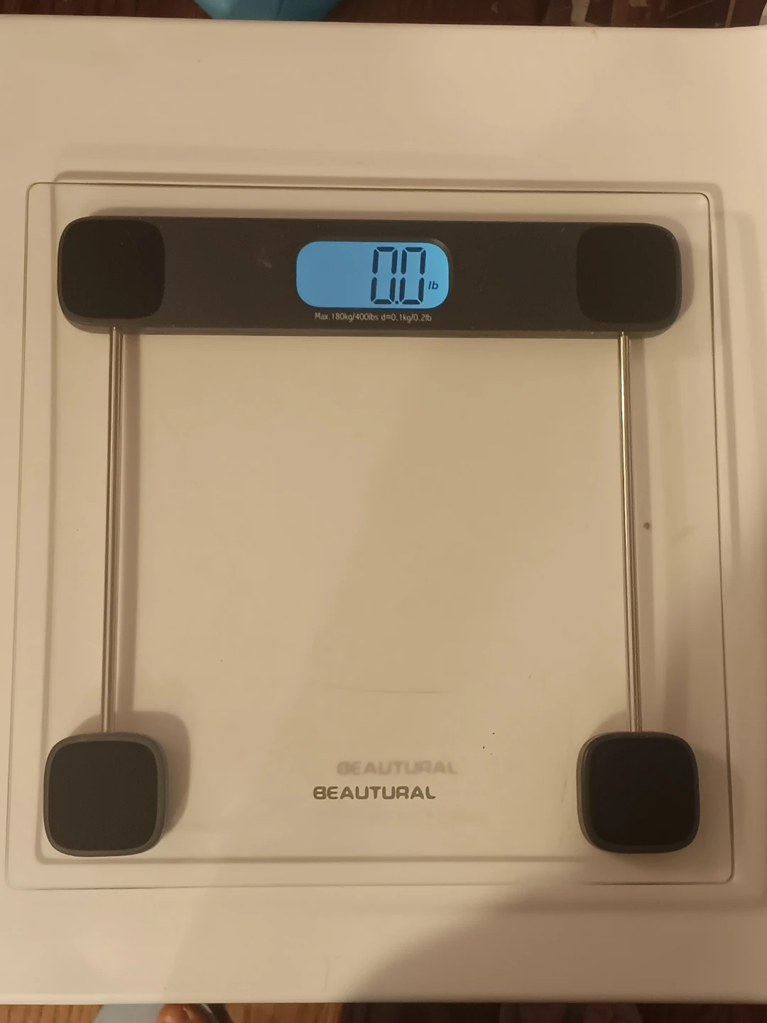 Selling a Beautural digital bathroom scale! It displays weight in pounds and kilos. The scale has a maximum capacity of 180kg/400lbs, with a precision of 0.2lb/ 0.1kg