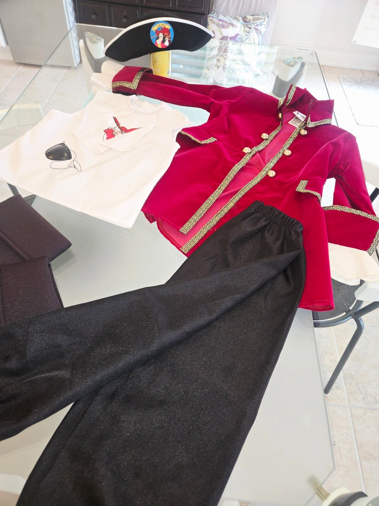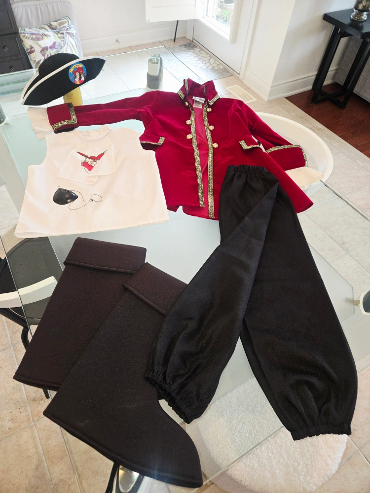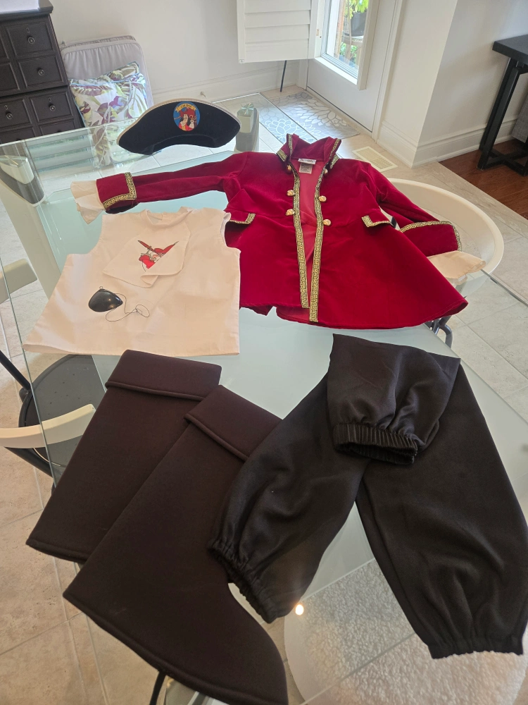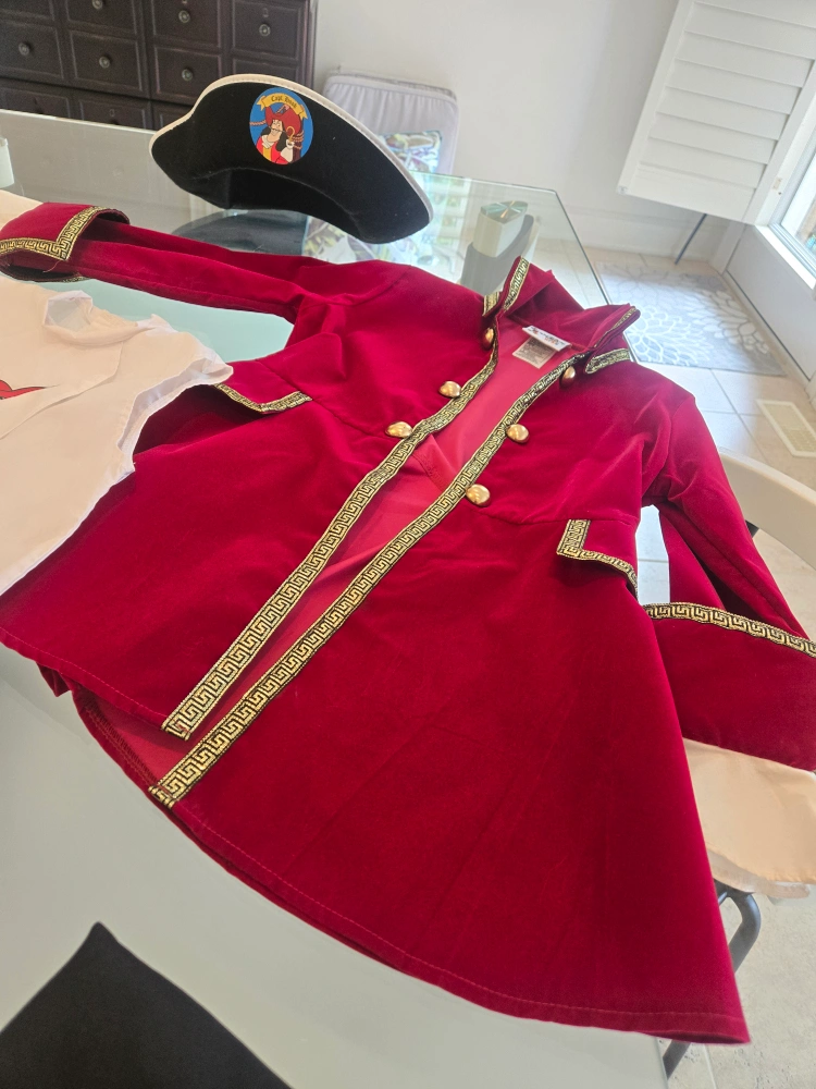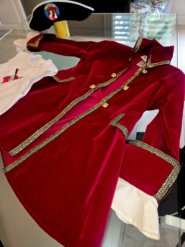 Get ready for adventure with this adorable Disney World Kids Peter Pan costume! It's a size small 6 to 8 and includes everything your little one needs to become the boy who never grows up: a red jacket, white top, black pants, and a matching hat, boots and eye cover.. Perfect for dress-up or Halloween!