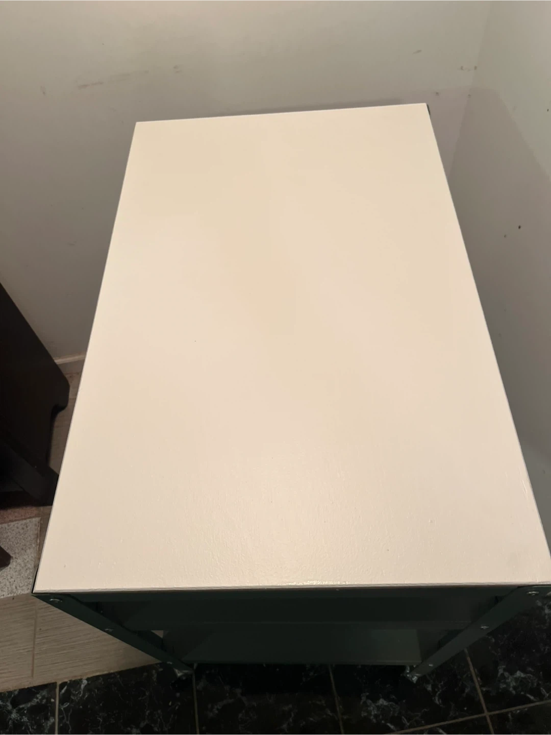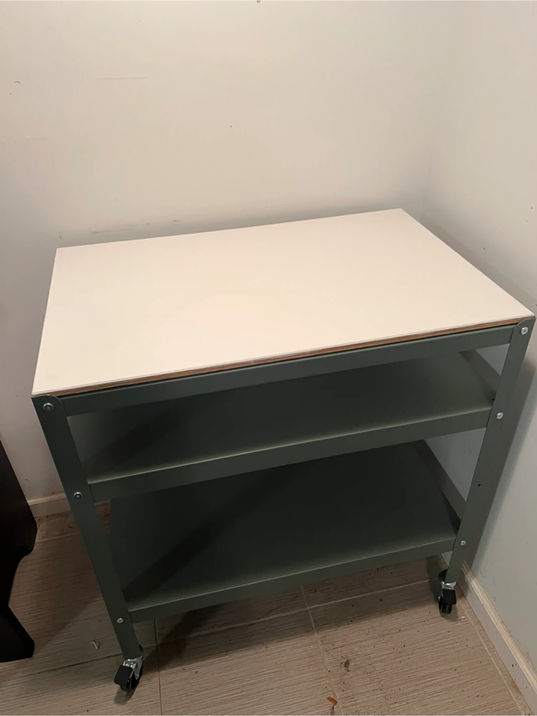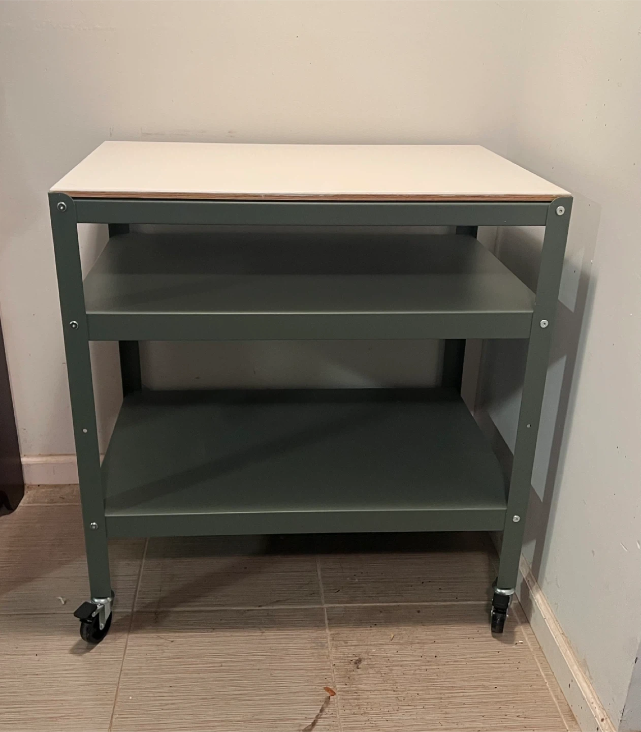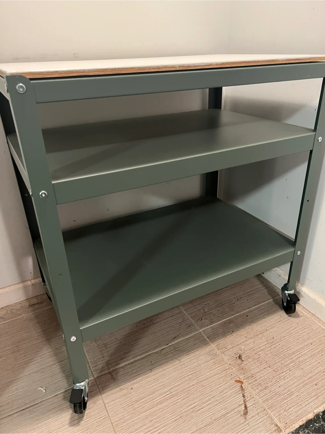 Selling in great condition, a utility cart with a metal frame and painted white plywood. Easily movable and equipped with sturdy wheels, it also features a wheel locking system to keep it in place. This cart is ideal for extra kitchen storage. Very lightly used, with minor cosmetic wear, but no broken parts.