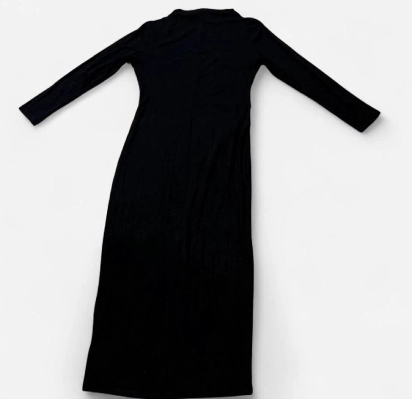 Black long sleeve midi dress with ruching on the side. It's a comfortable, versatile dress perfect for many occasions. Made from a soft, stretchy material.