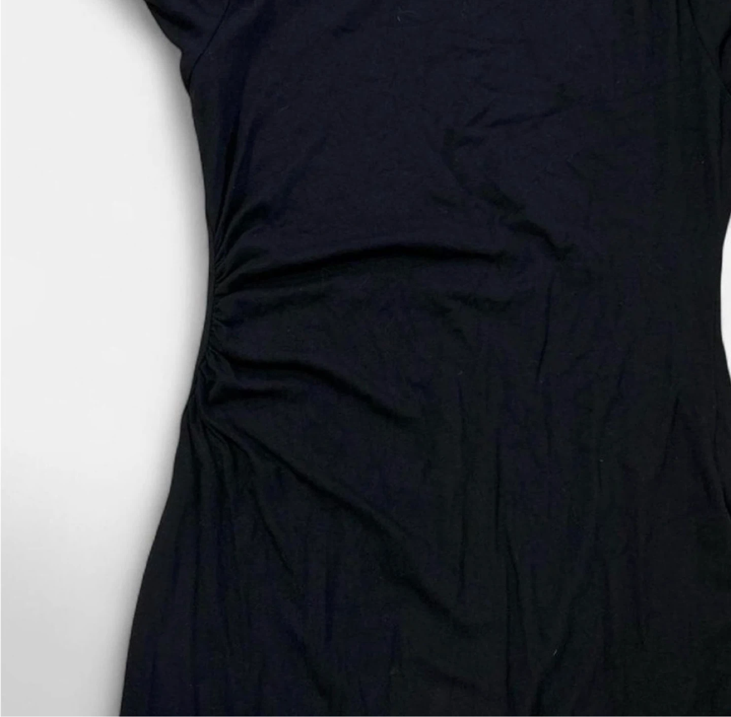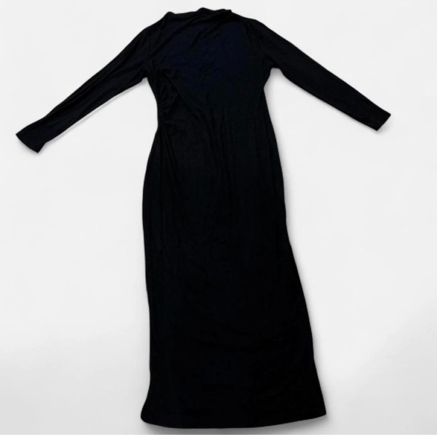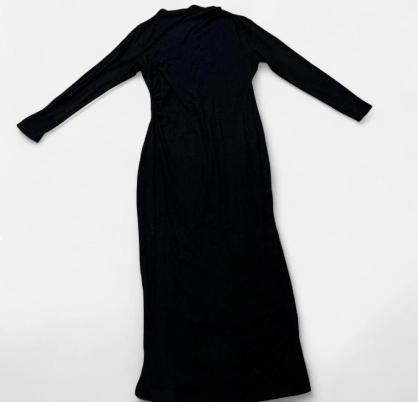 Black long sleeve midi dress with ruching on the side. It's a comfortable, versatile dress perfect for many occasions. Made from a soft, stretchy material.