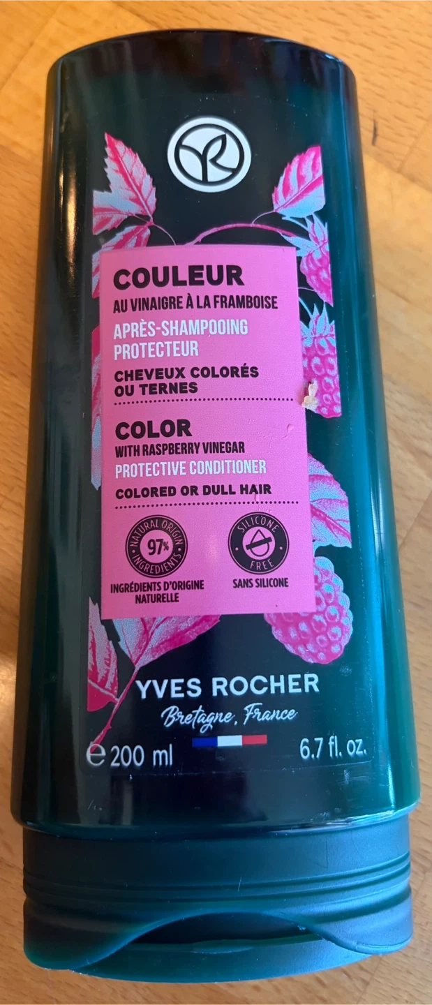 Yves Rocher Color Protecting Conditioner with Raspberry Vinegar. This 200 ml bottle is designed for colored or dull hair. It helps nourish hair without weighing it down, leaving it soft and shiny.