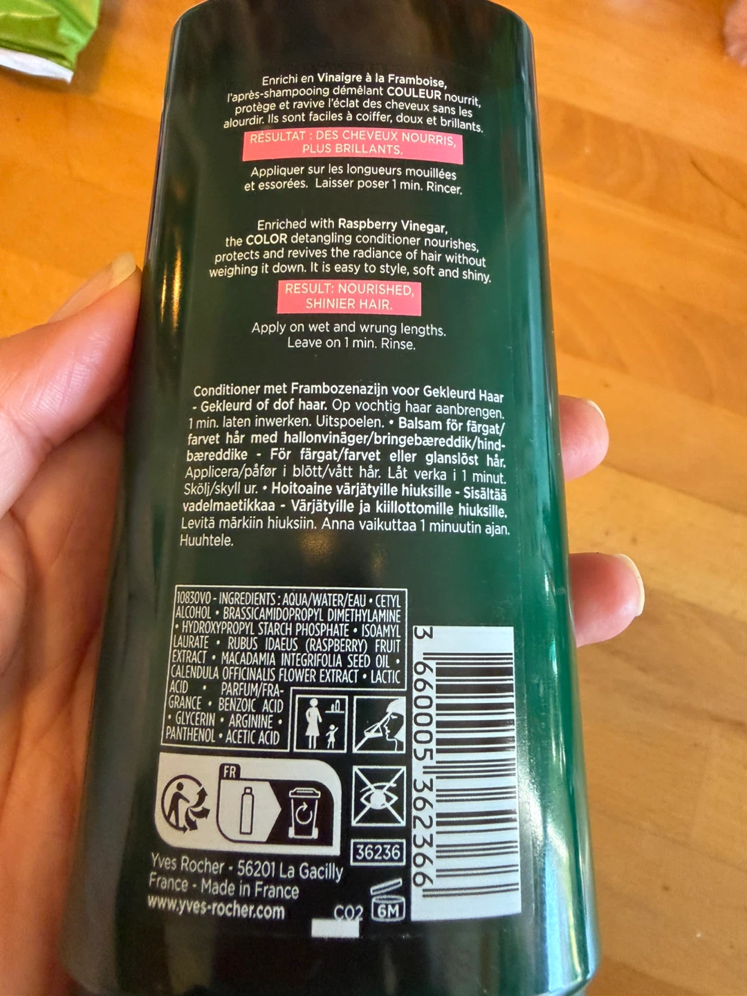 Yves Rocher Color Protecting Conditioner with Raspberry Vinegar. This 200 ml bottle is designed for colored or dull hair. It helps nourish hair without weighing it down, leaving it soft and shiny.