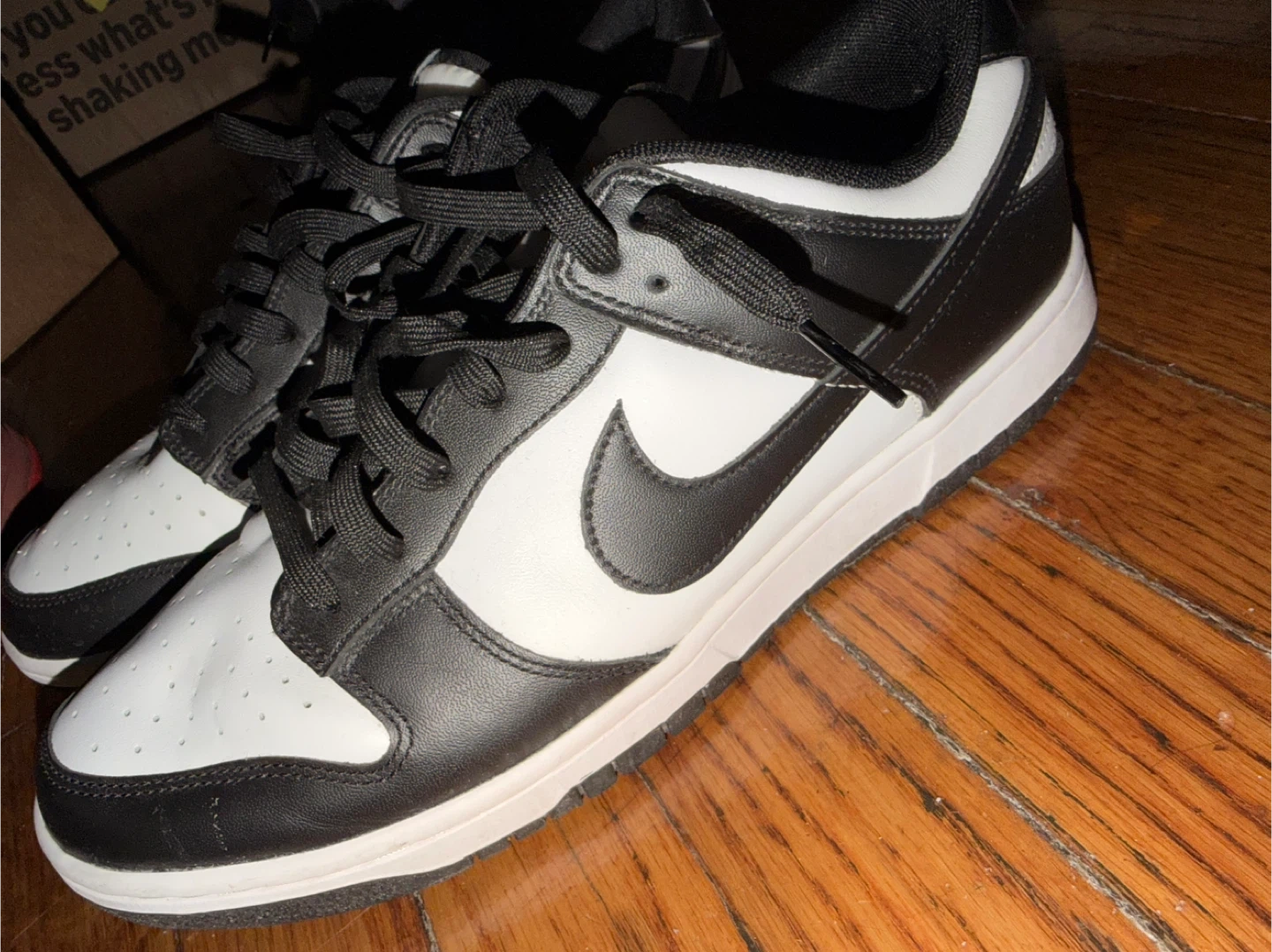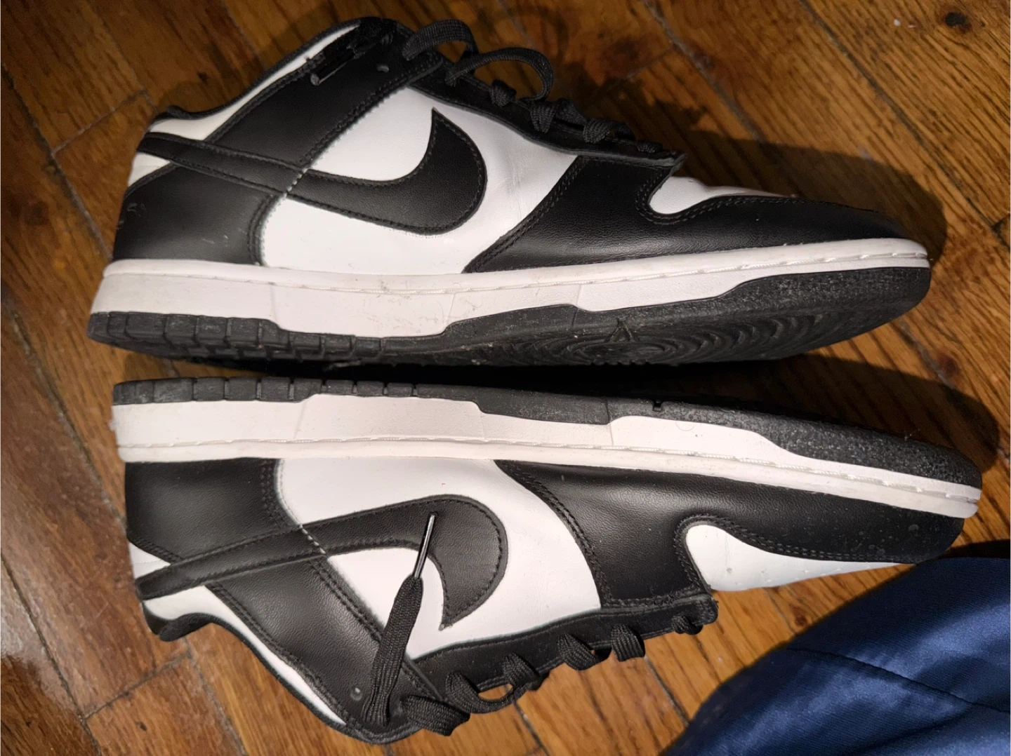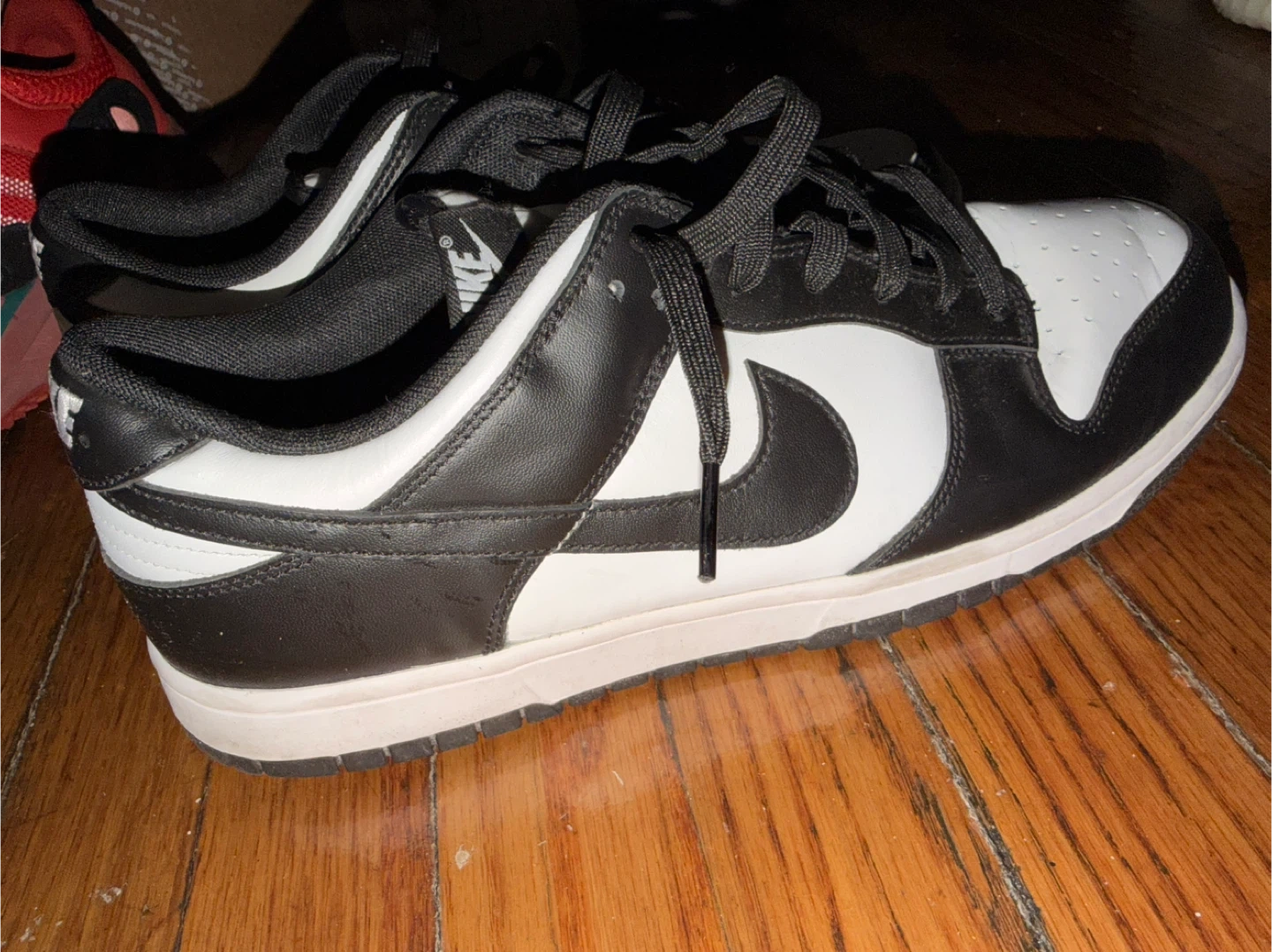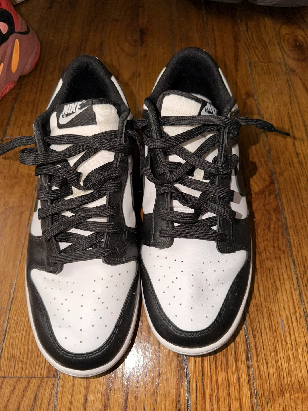 Classic black and white Nike Dunk Low sneakers. These low-top kicks feature a leather upper and rubber sole. They're perfect for everyday wear and have that iconic panda colorway! A timeless style for any sneaker collection. Needs some minor cleaning. (No box size 11.5 Men)