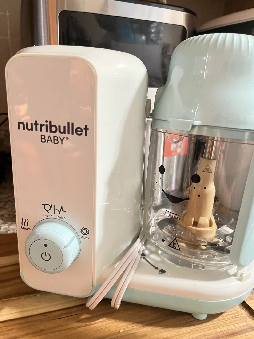 This NutriBullet Baby steams and blends homemade baby food. It features a water reservoir for steaming and a blending container. It has settings for steam, blend, pulse, and auto functions.