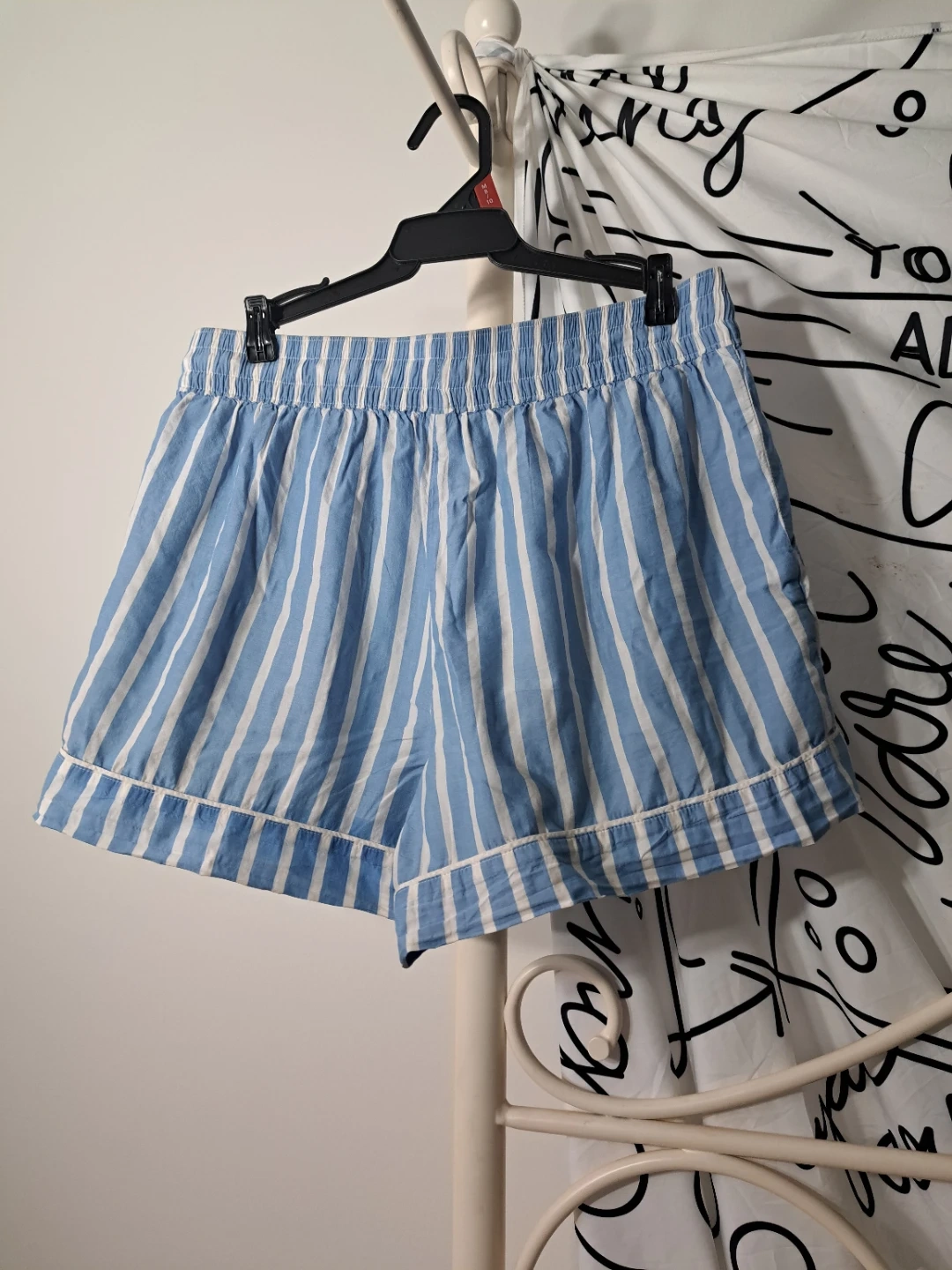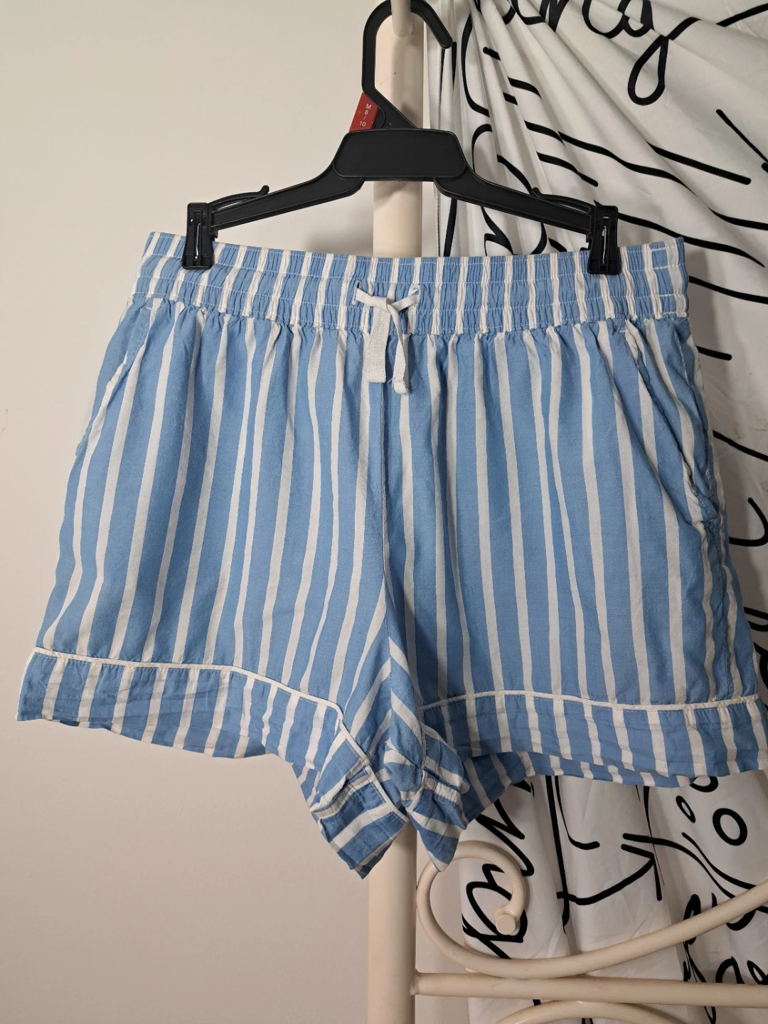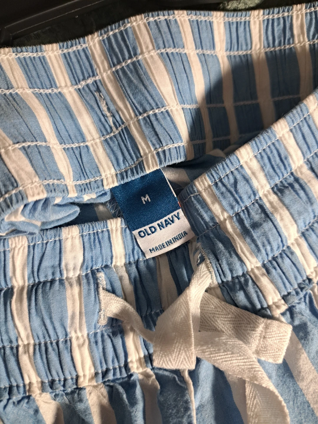Comfy Old Navy shorts. Blue and white vertical stripes. Structured material. Elastic waistband with a drawstring. Size Medium. Perfect for lounging, or going to the beach!