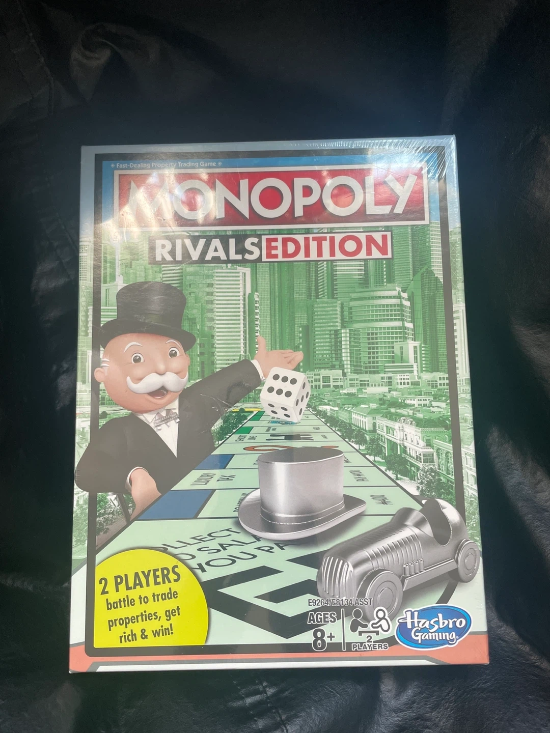 This is the Monopoly Rivals Edition board game. It's for 2 players and includes 16 Chance cards, 16 Community Chest cards, 2 zinc tokens, 16 red houses, and money pack. The game guide is also included.
