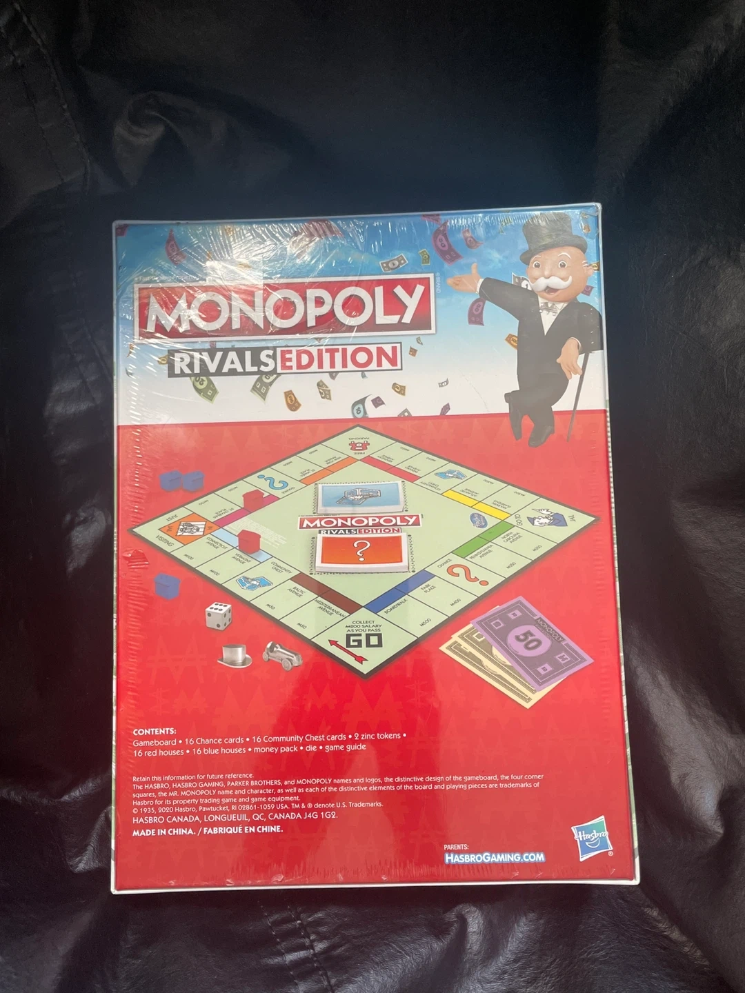 This is the Monopoly Rivals Edition board game. It's for 2 players and includes 16 Chance cards, 16 Community Chest cards, 2 zinc tokens, 16 red houses, and money pack. The game guide is also included.