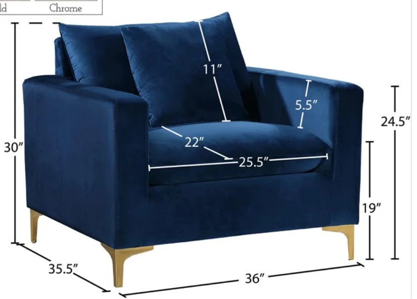 Selling a beautiful navy velvet armchair that's in excellent condition! It comes with a matching pillow for extra comfort. The chair measures approximately 36" wide, 35.5" deep, and 30" high. The seat height is about 19". It's a stylish and comfortable addition to any living space