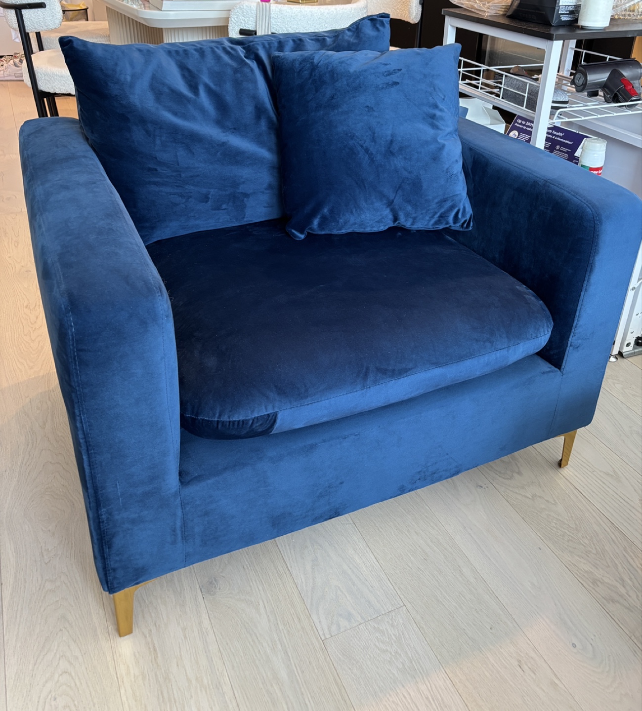 Selling a beautiful navy velvet armchair that's in excellent condition! It comes with a matching pillow for extra comfort. The chair measures approximately 36" wide, 35.5" deep, and 30" high. The seat height is about 19". It's a stylish and comfortable addition to any living space