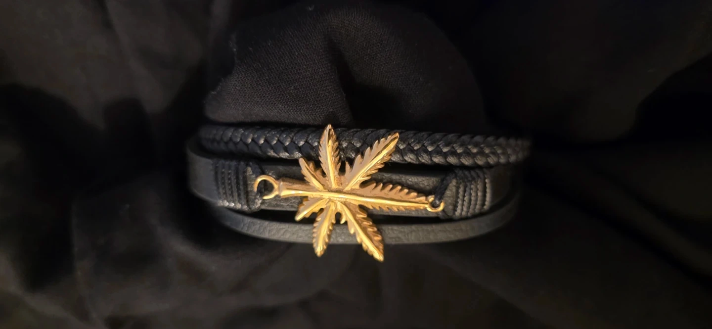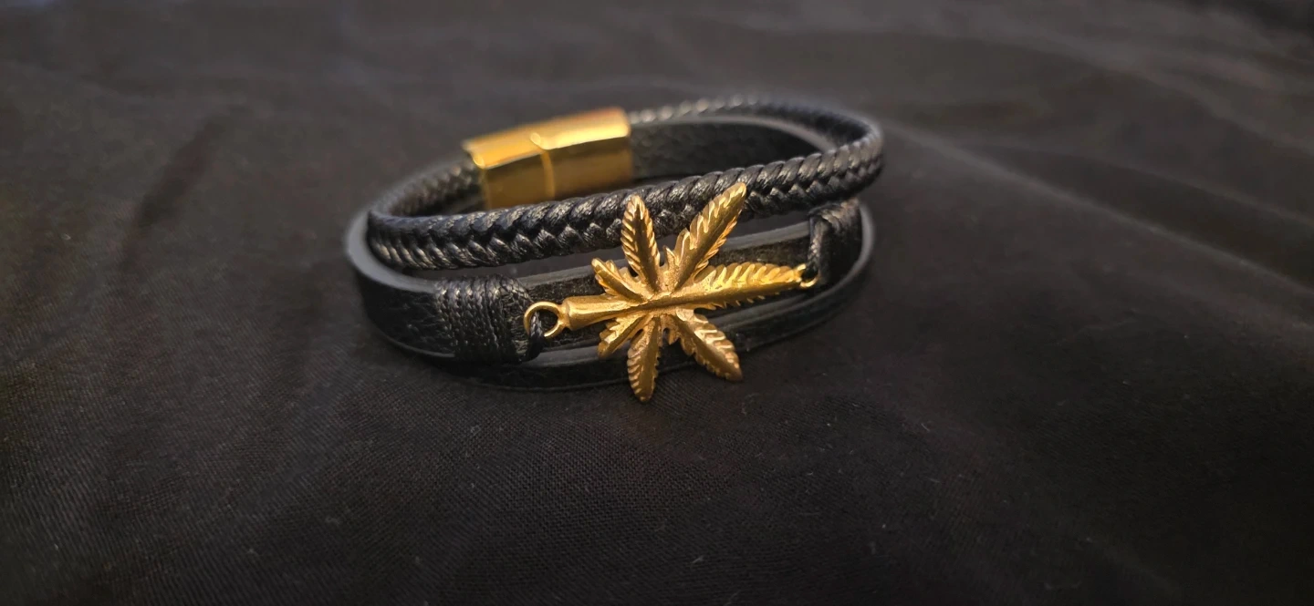 Selling a stylish leather bracelet featuring a distinctive gold leaf charm. This bracelet is perfect for adding a touch of elegance to any outfit, and ready to be worn!