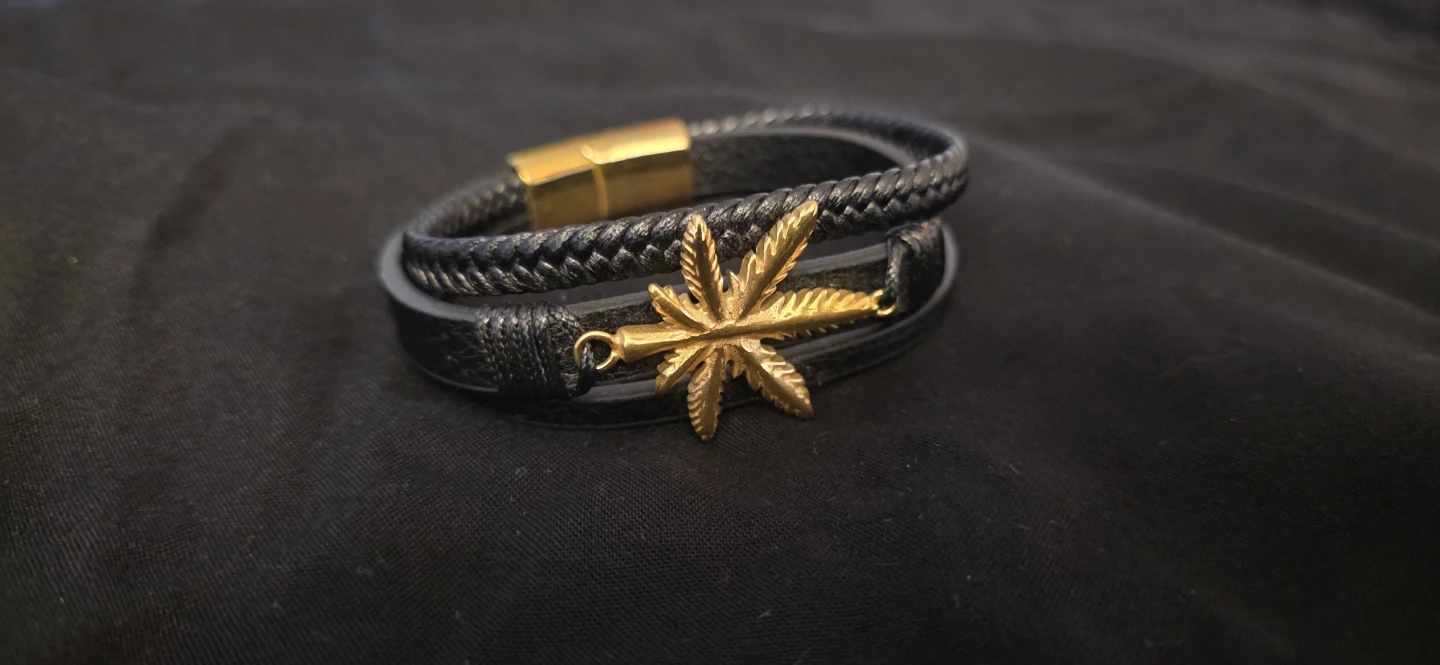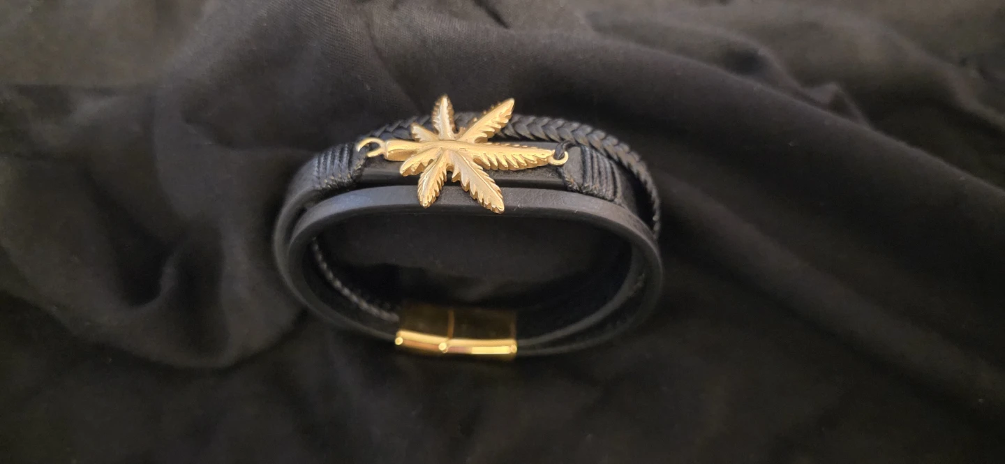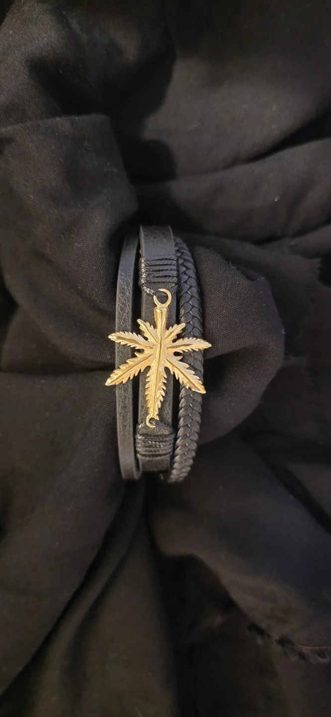 Selling a stylish leather bracelet featuring a distinctive gold leaf charm. This bracelet is perfect for adding a touch of elegance to any outfit, and ready to be worn!