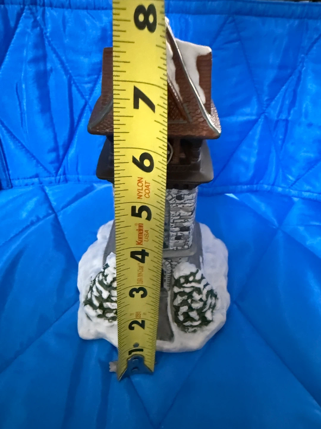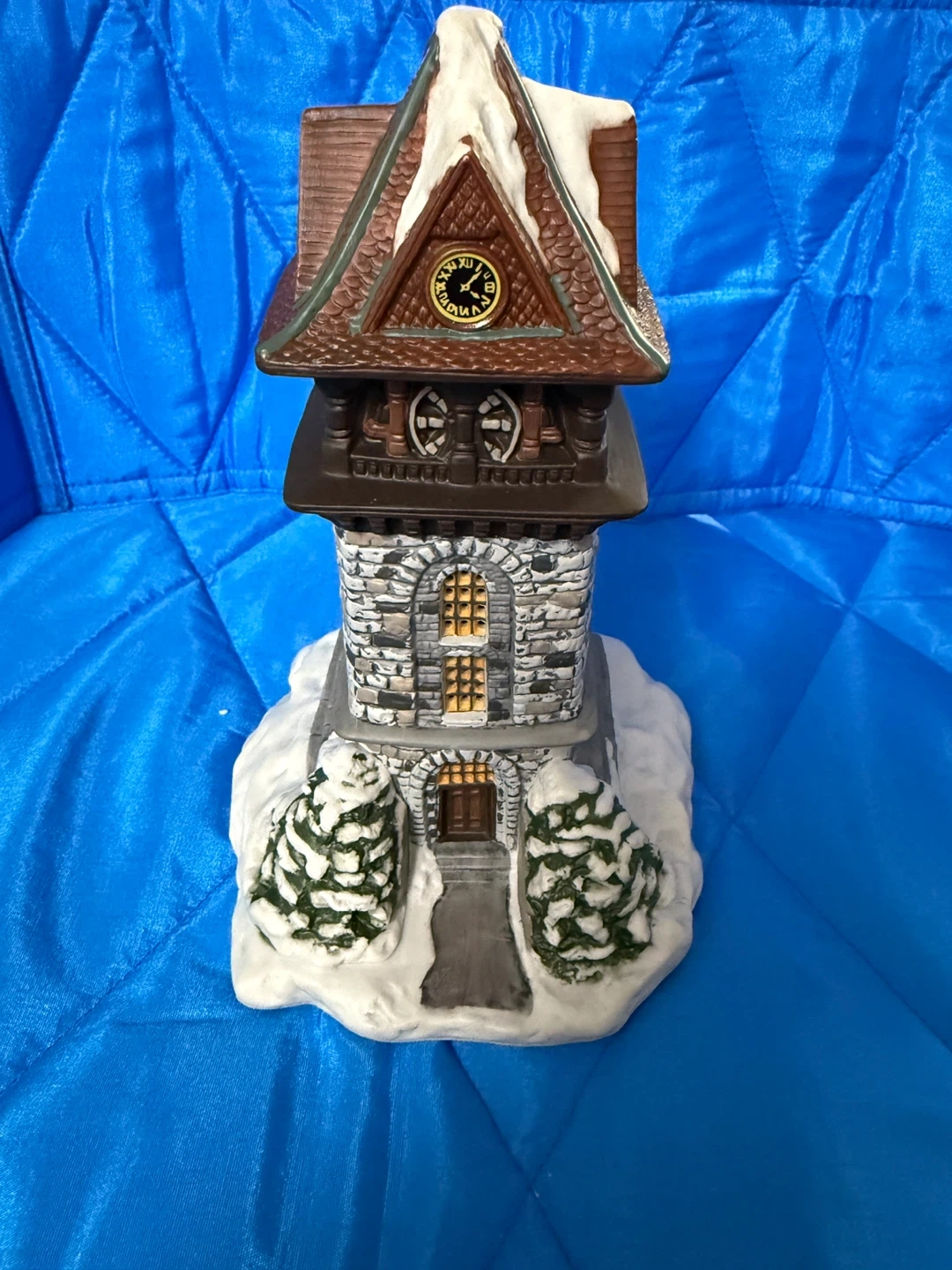 This is a charming Christmas village figurine featuring a clock tower. It's a lovely decorative piece to add to your holiday collection!