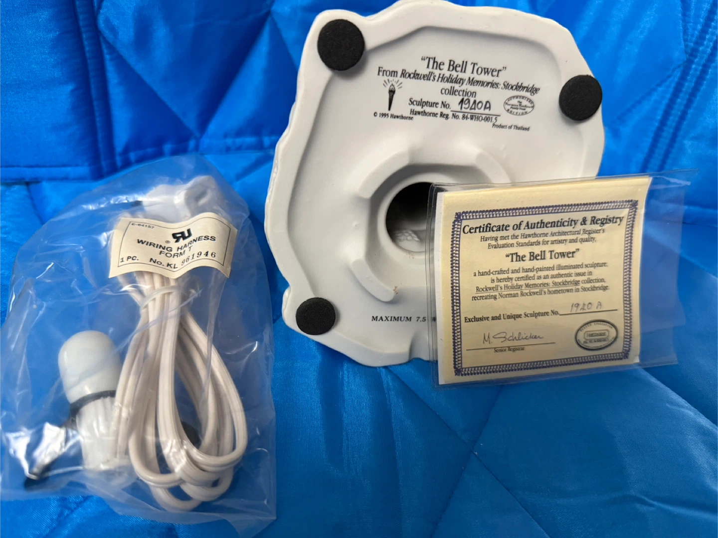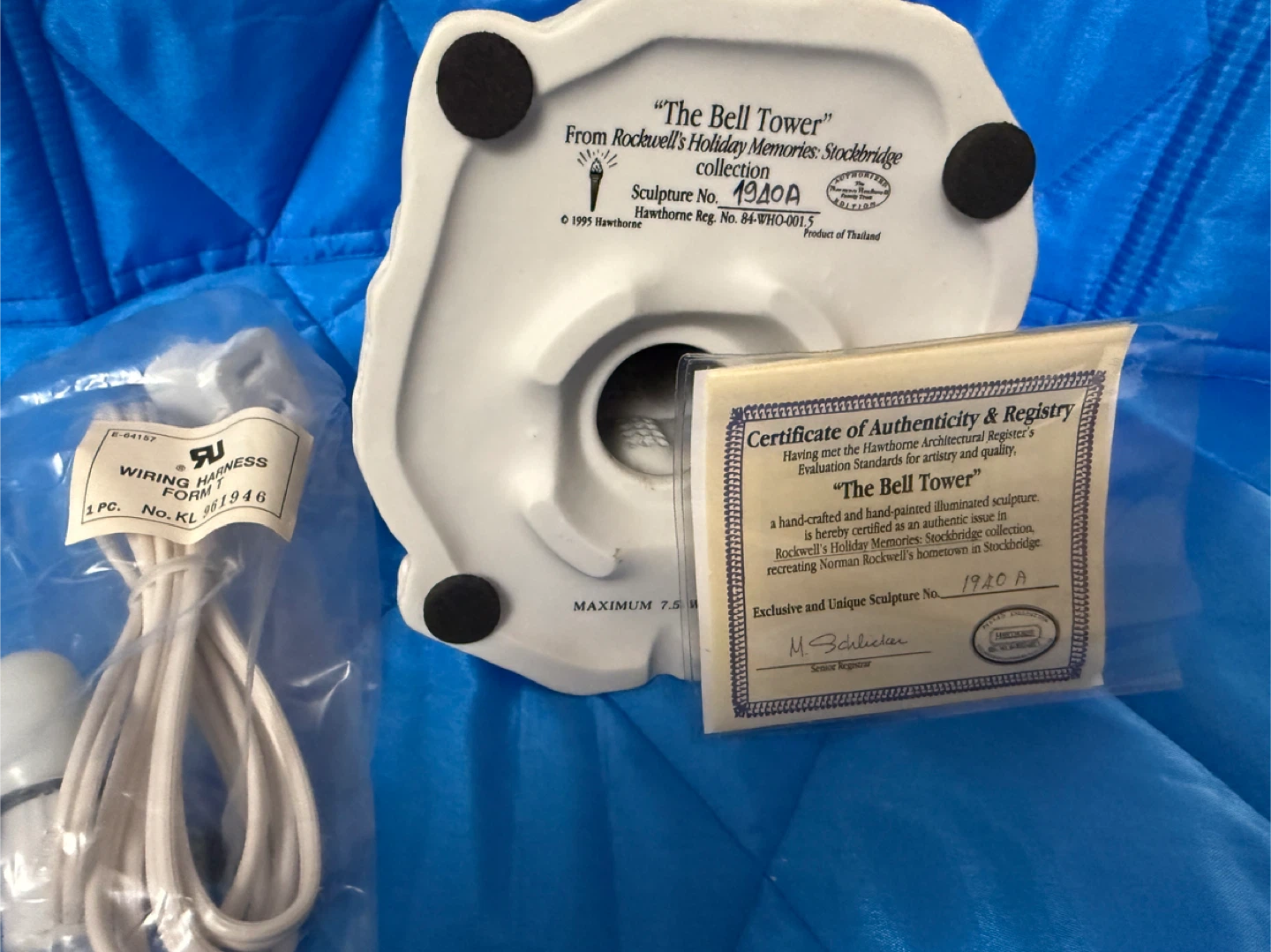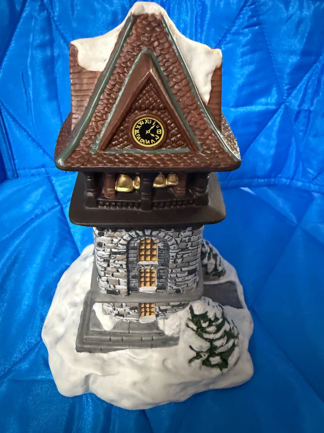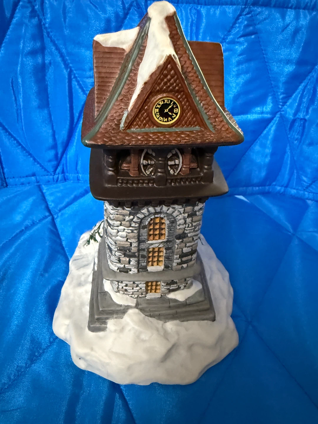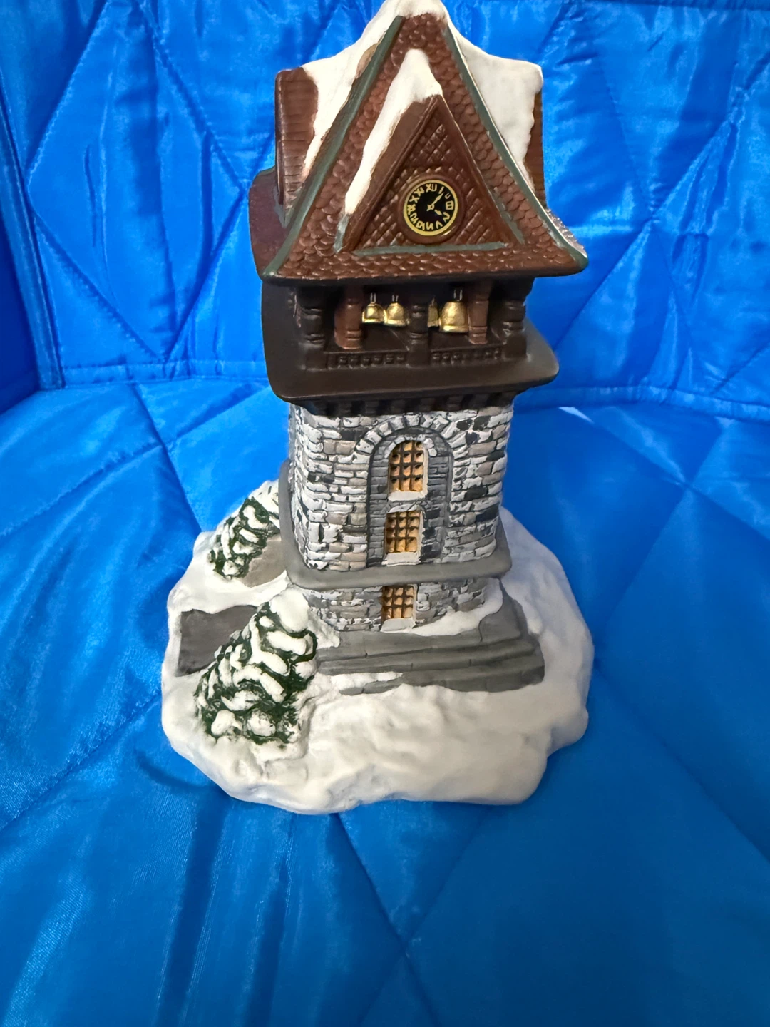 This is a charming Christmas village figurine featuring a clock tower. It's a lovely decorative piece to add to your holiday collection!
