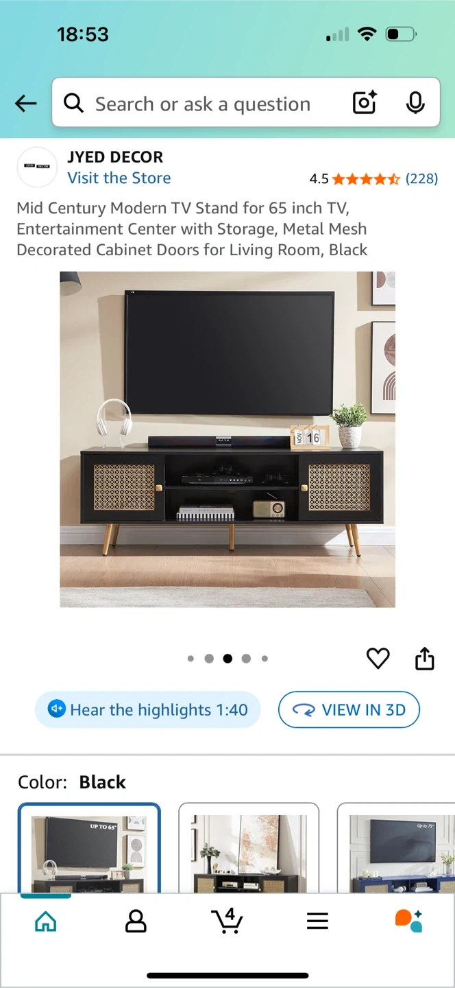 20Selling a JYED DECOR Mid Century Modern TV Stand in black. It's designed for a 65 inch TV and features an entertainment center with storage and metal mesh decorated cabinet doors. - Brand: JYED DECOR - Color: Black - Material: Engineered Wood - Dimensions: 15.55"D x 59.06"W x 20.87"H