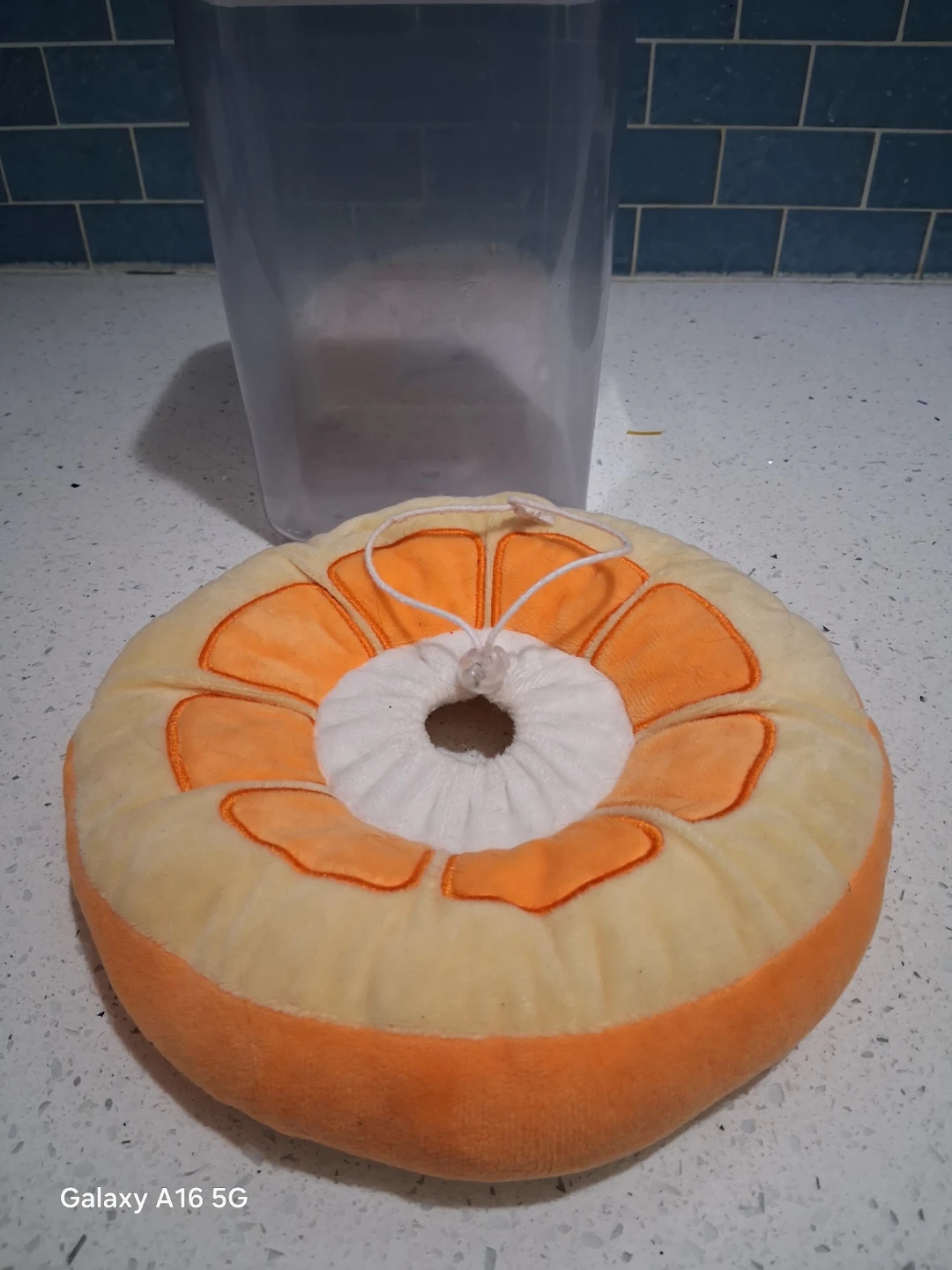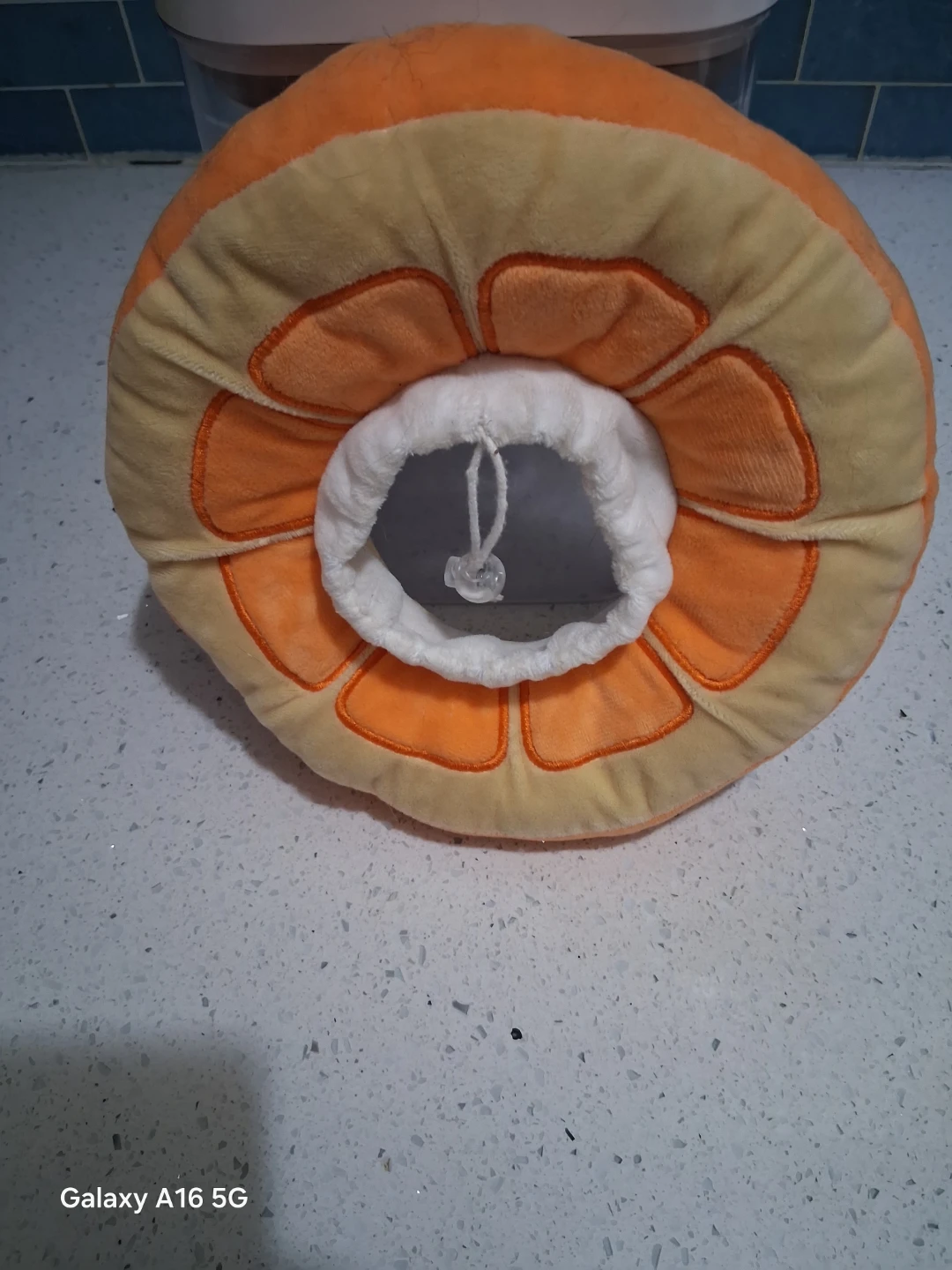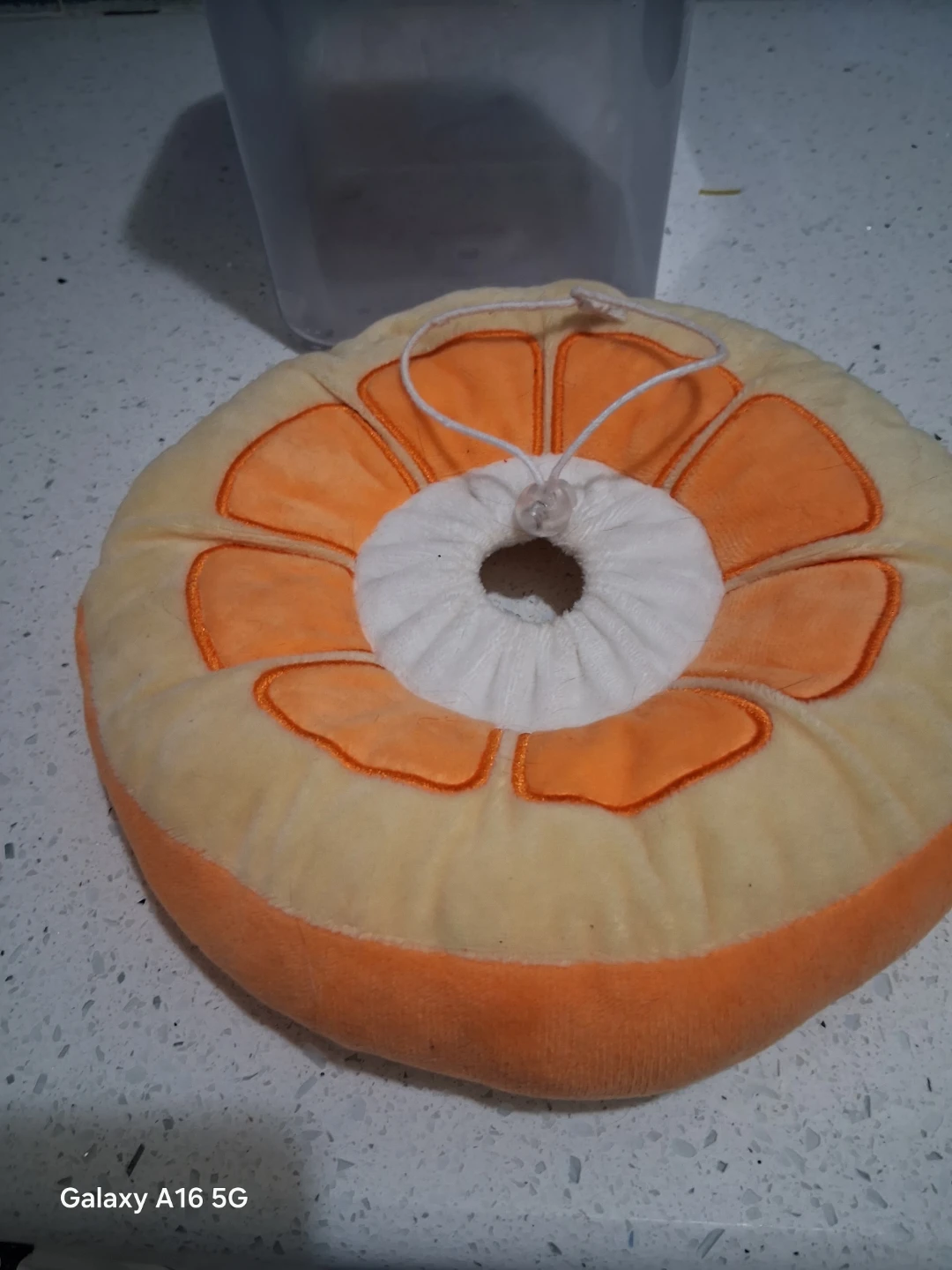 This is a plush cone collar shaped like an orange slice. It's designed to prevent pets from licking wounds or irritating skin. Adjustable drawstring closure for a comfortable fit.