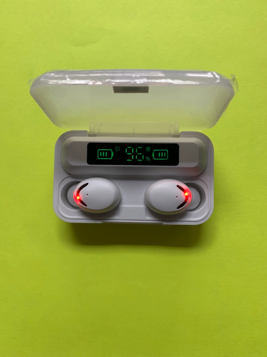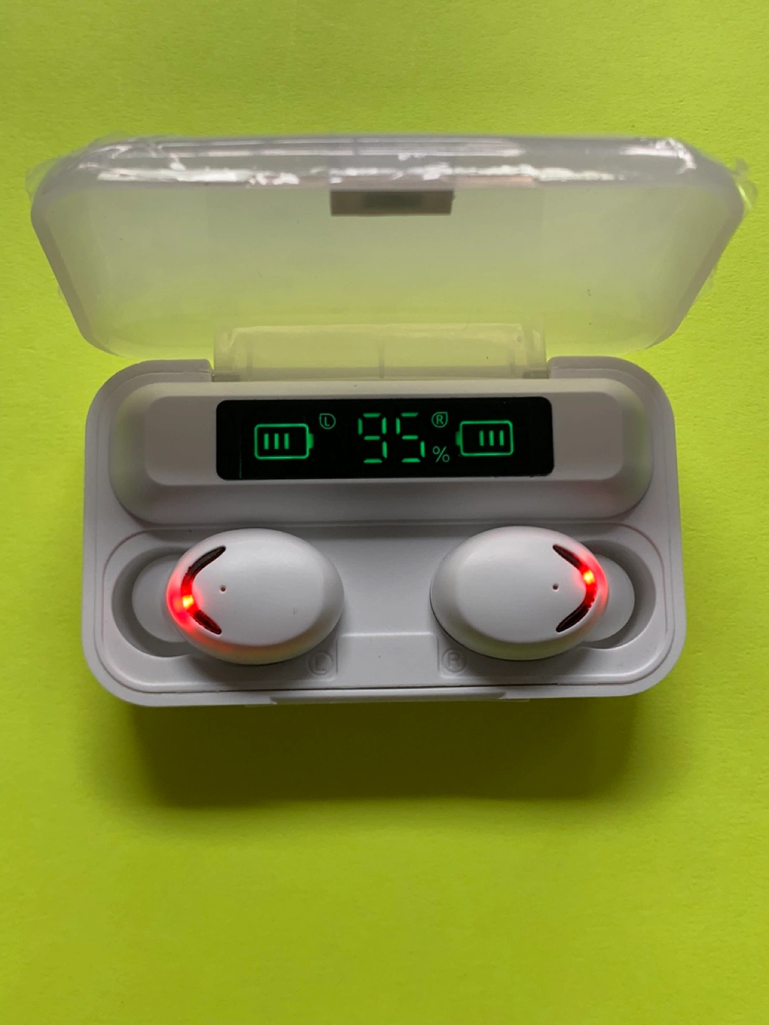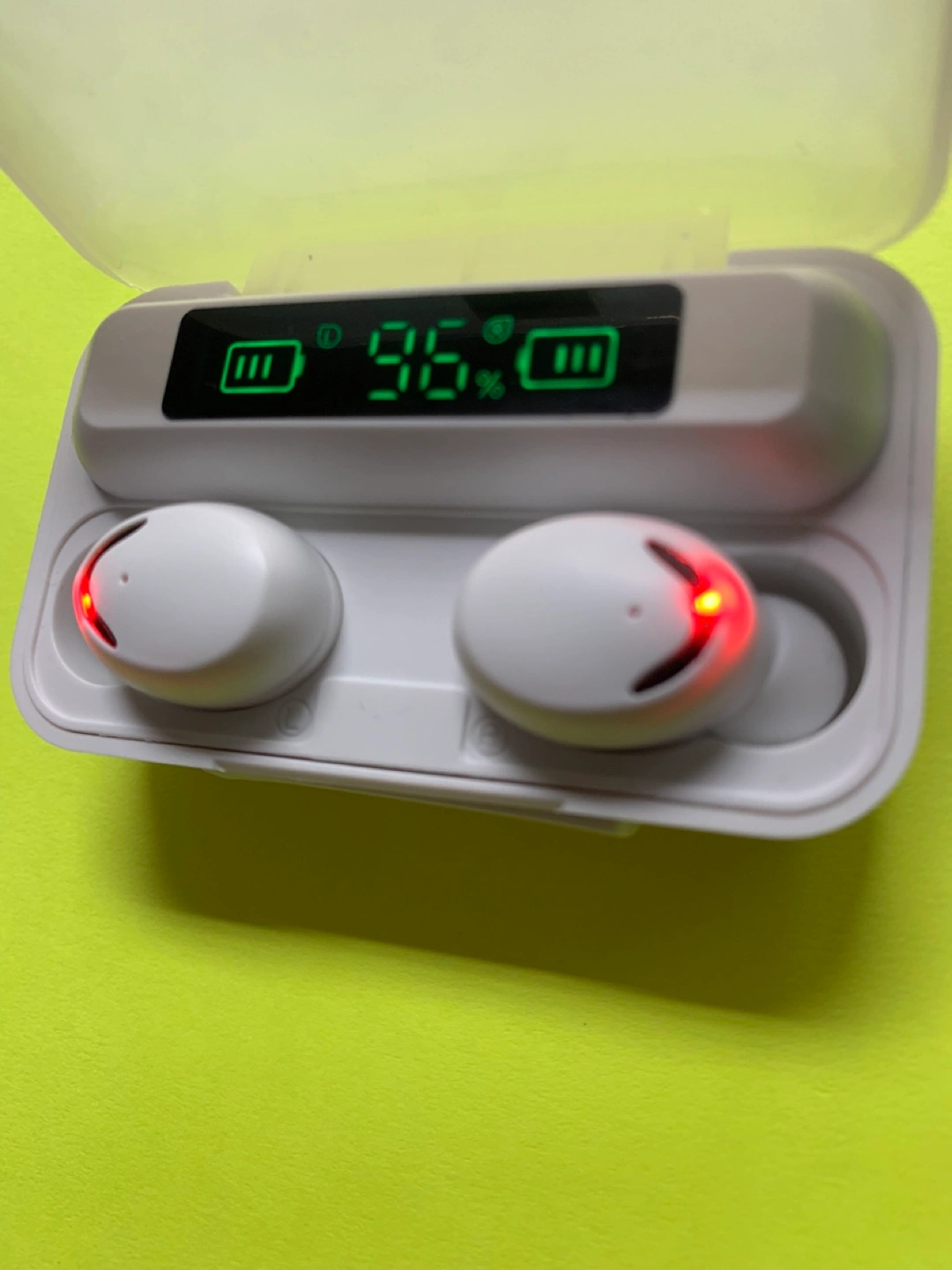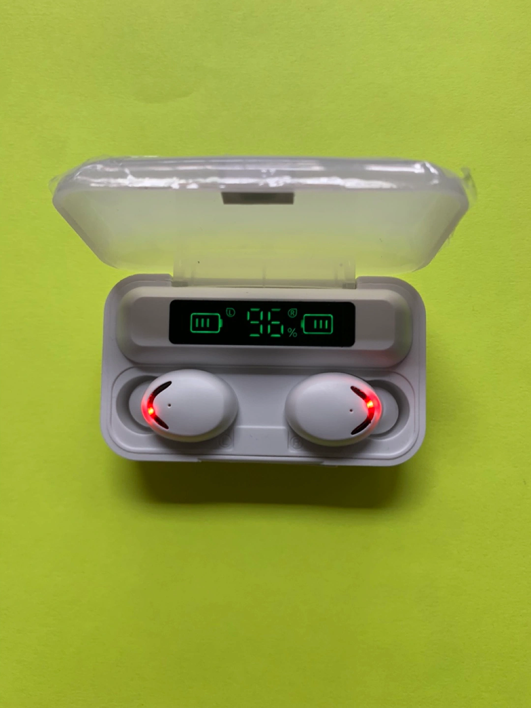 White earbuds, in-ear style. Charging case included, digital battery display. Portable and compact design. Perfect for listening to music on the go.