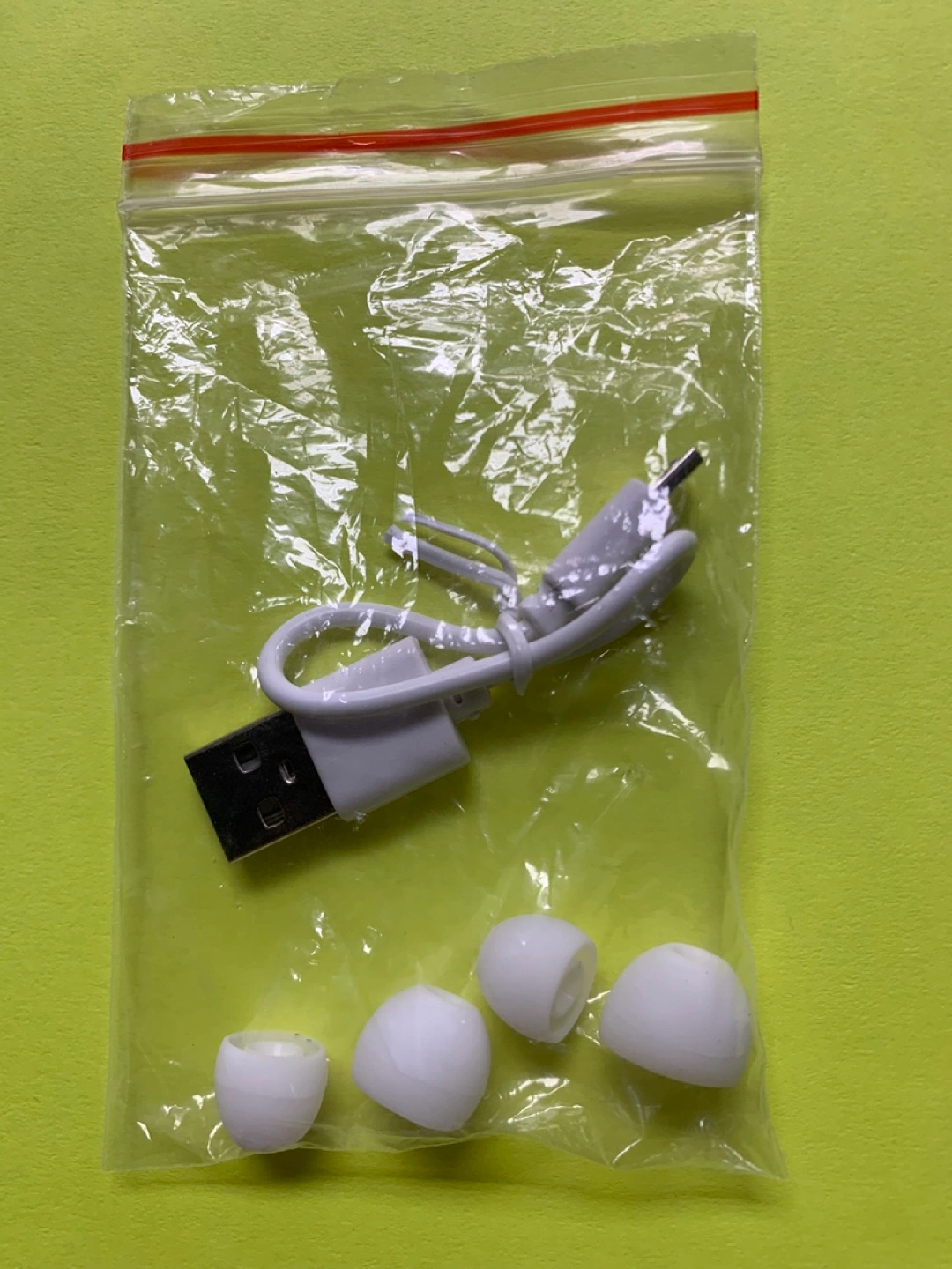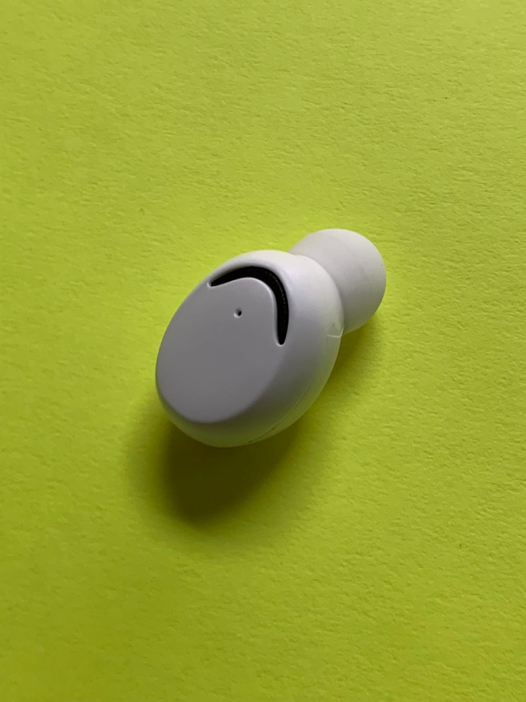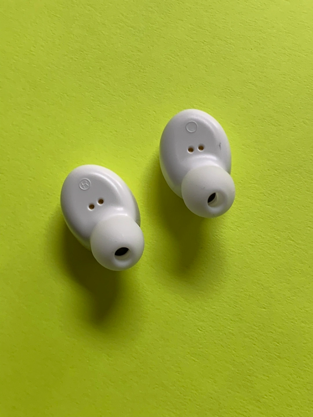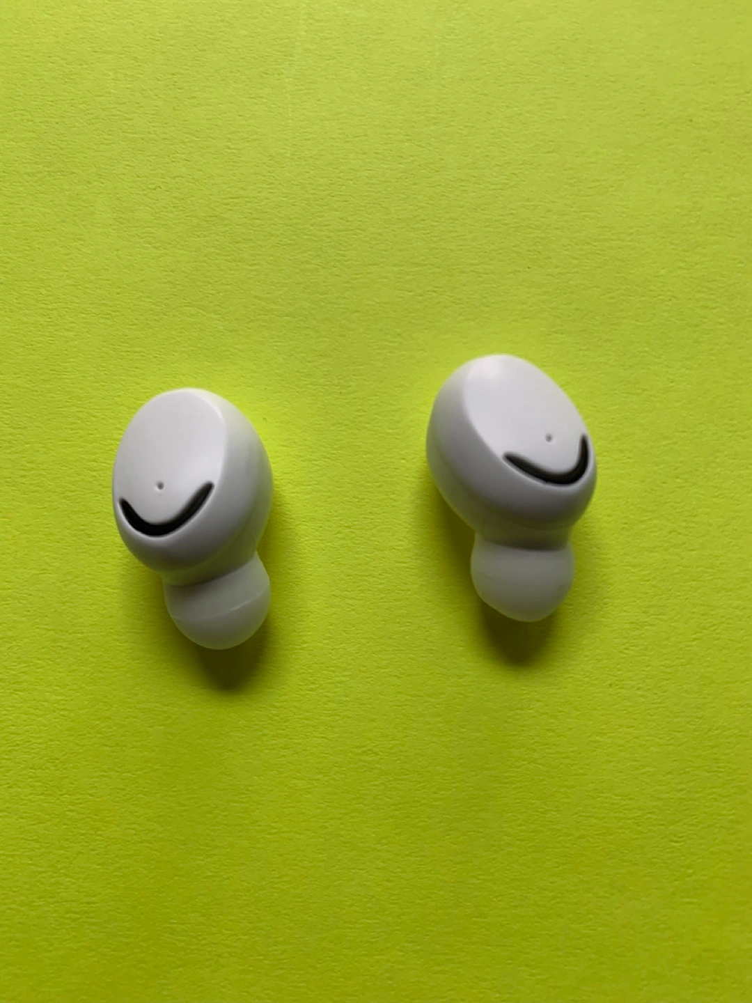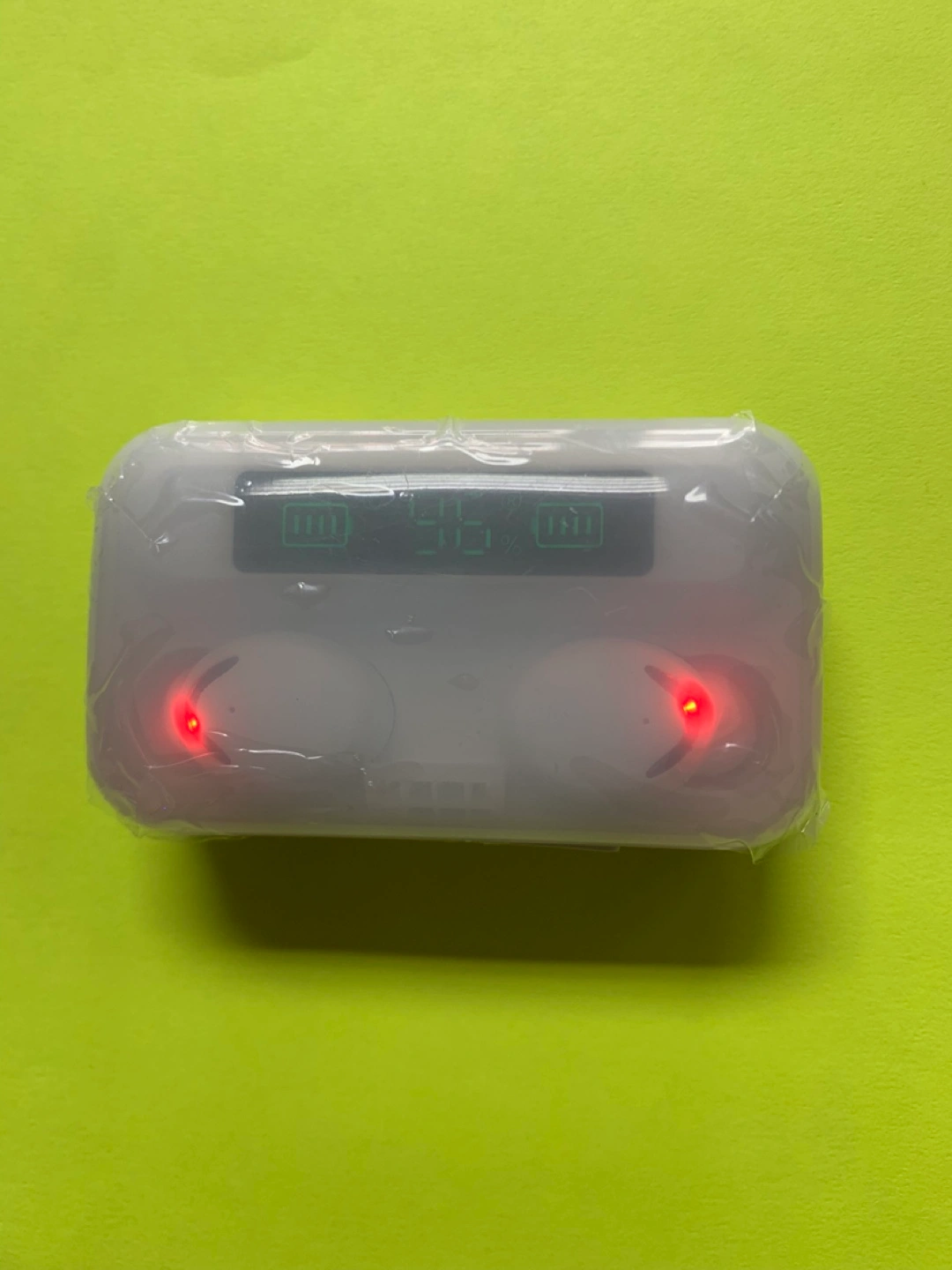 White earbuds, in-ear style. Charging case included, digital battery display. Portable and compact design. Perfect for listening to music on the go.