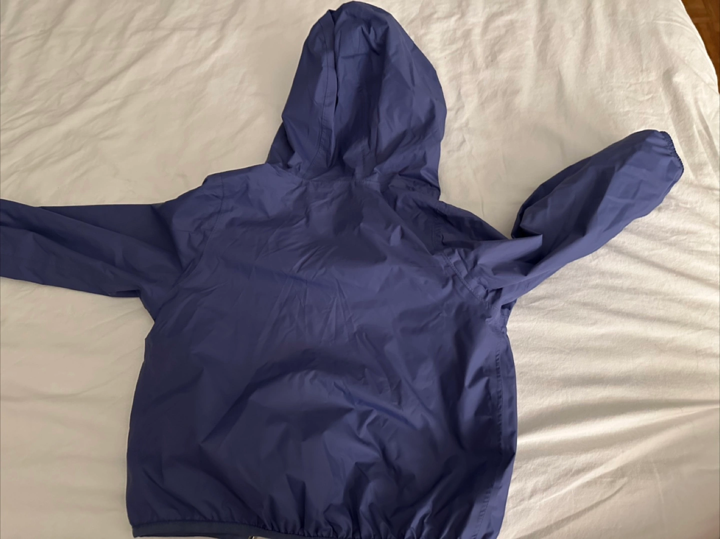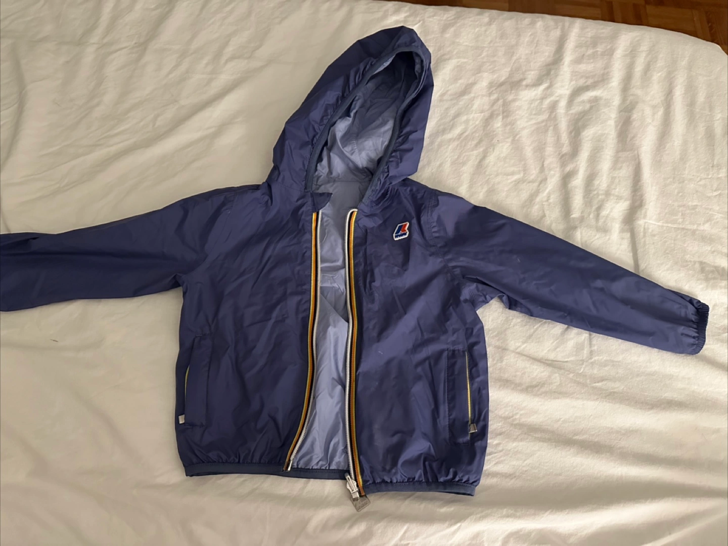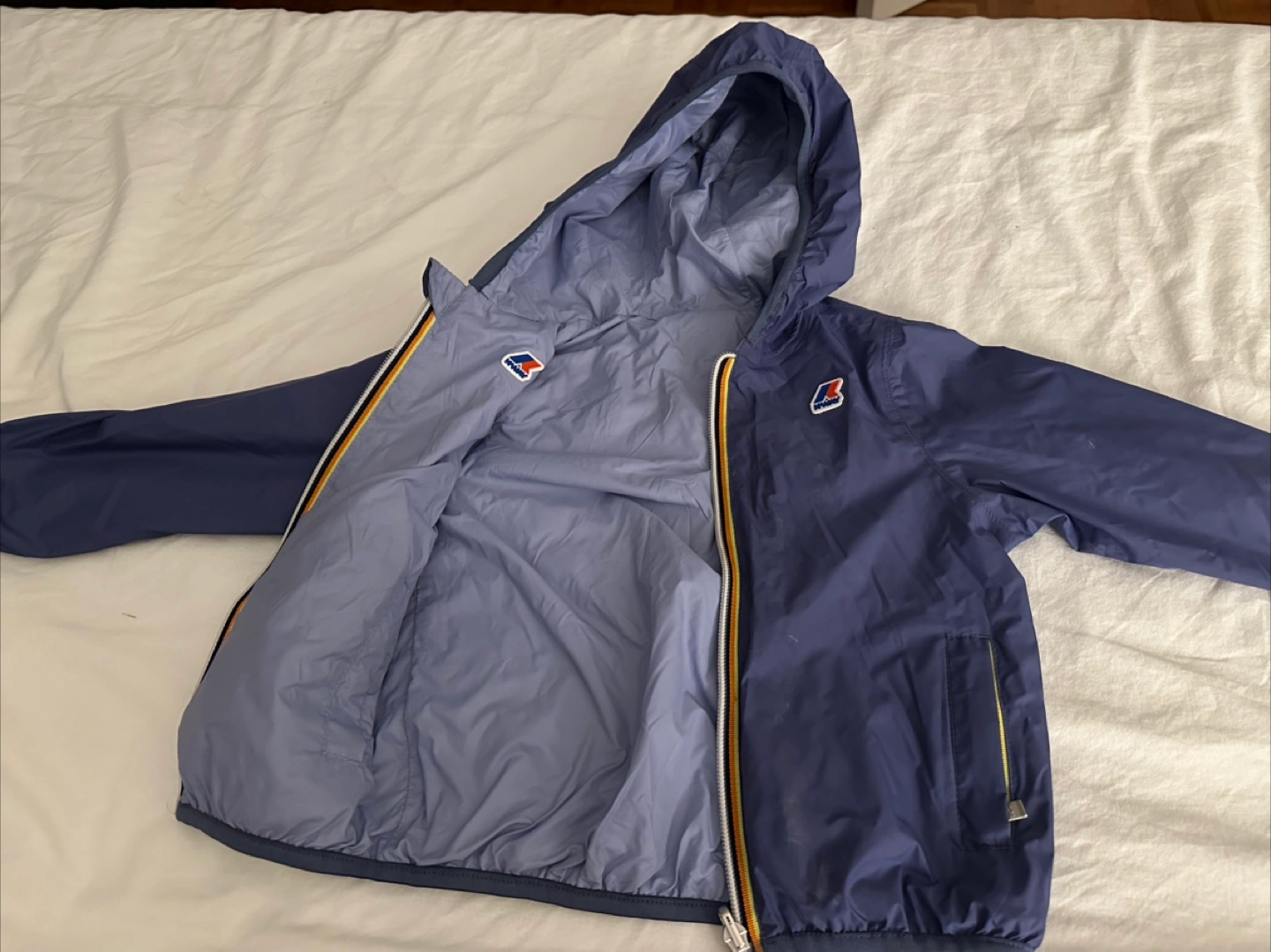 Selling a K-Way kids' jacket in double face blue. It's in great condition and perfect for keeping your little one dry on rainy days. The jacket is lightweight and portable, making it easy to pack for trips or keep in a backpack. Size 3 years