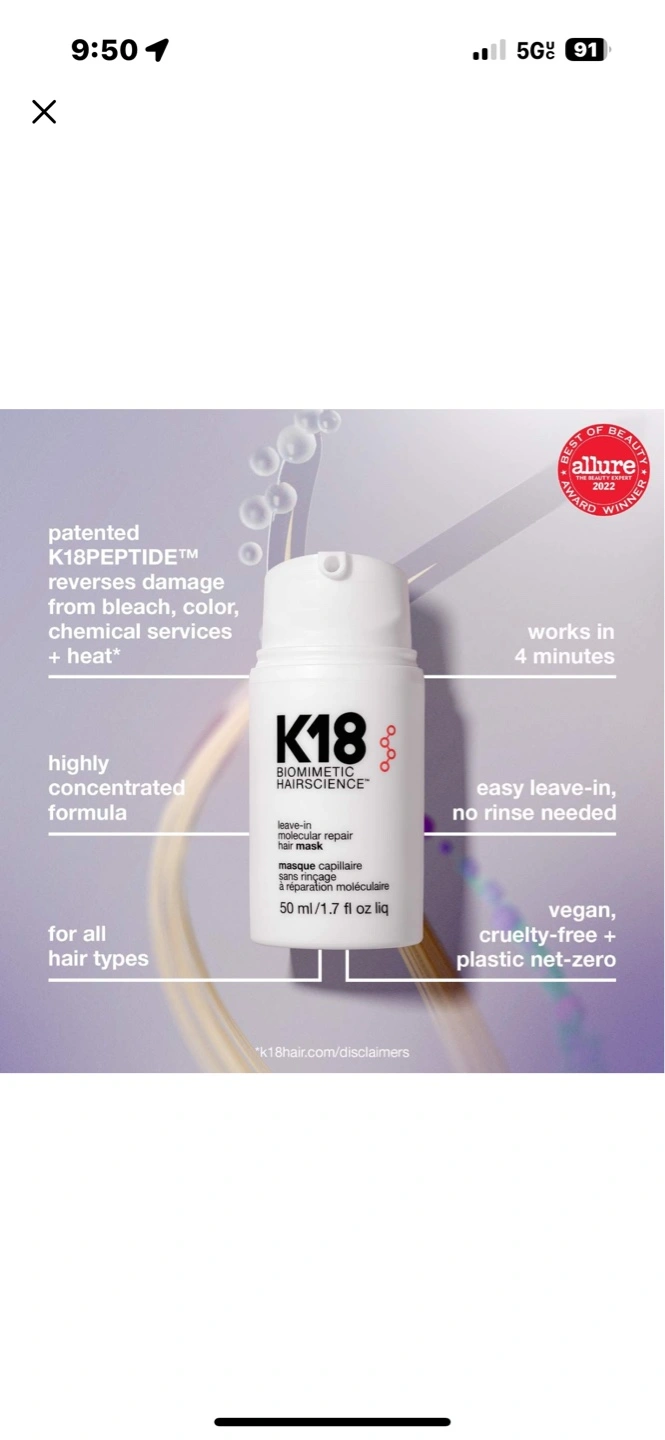50ml/1.7 fl oz leave-in hair mask. Molecular repair. Easy to use, no rinse needed. For all hair types. Vegan and cruelty-free. Works in 4 minutes. Reverses damage from bleach, color, chemical services, and heat.