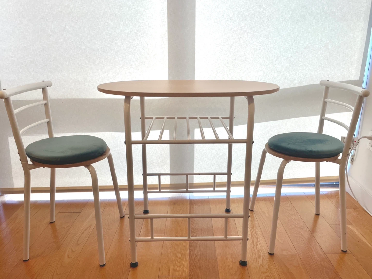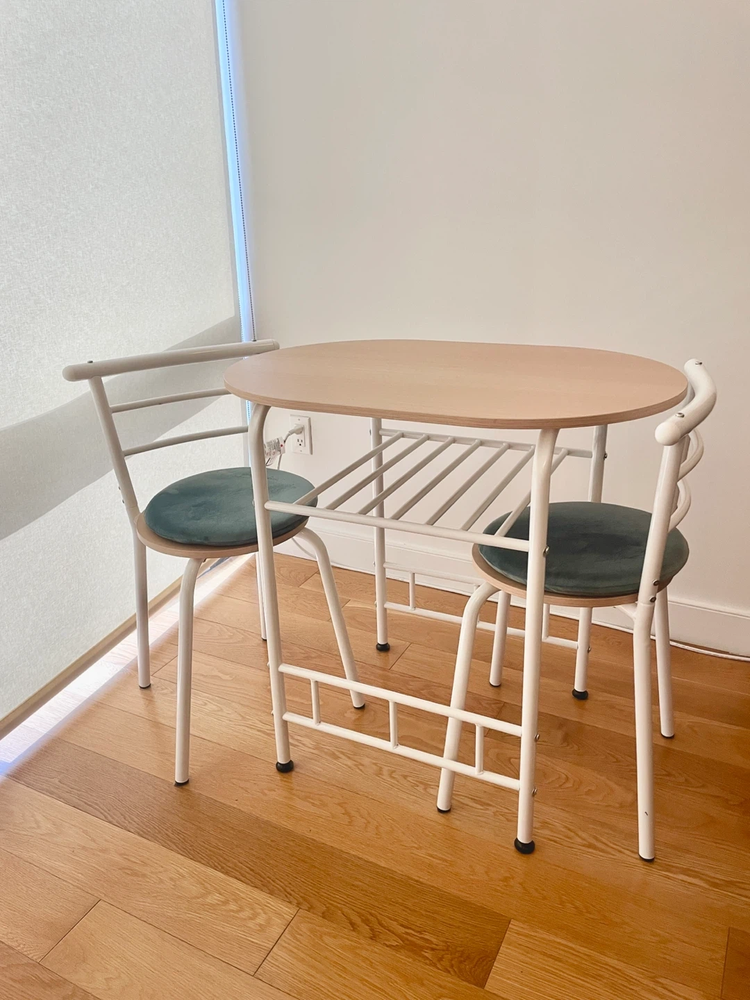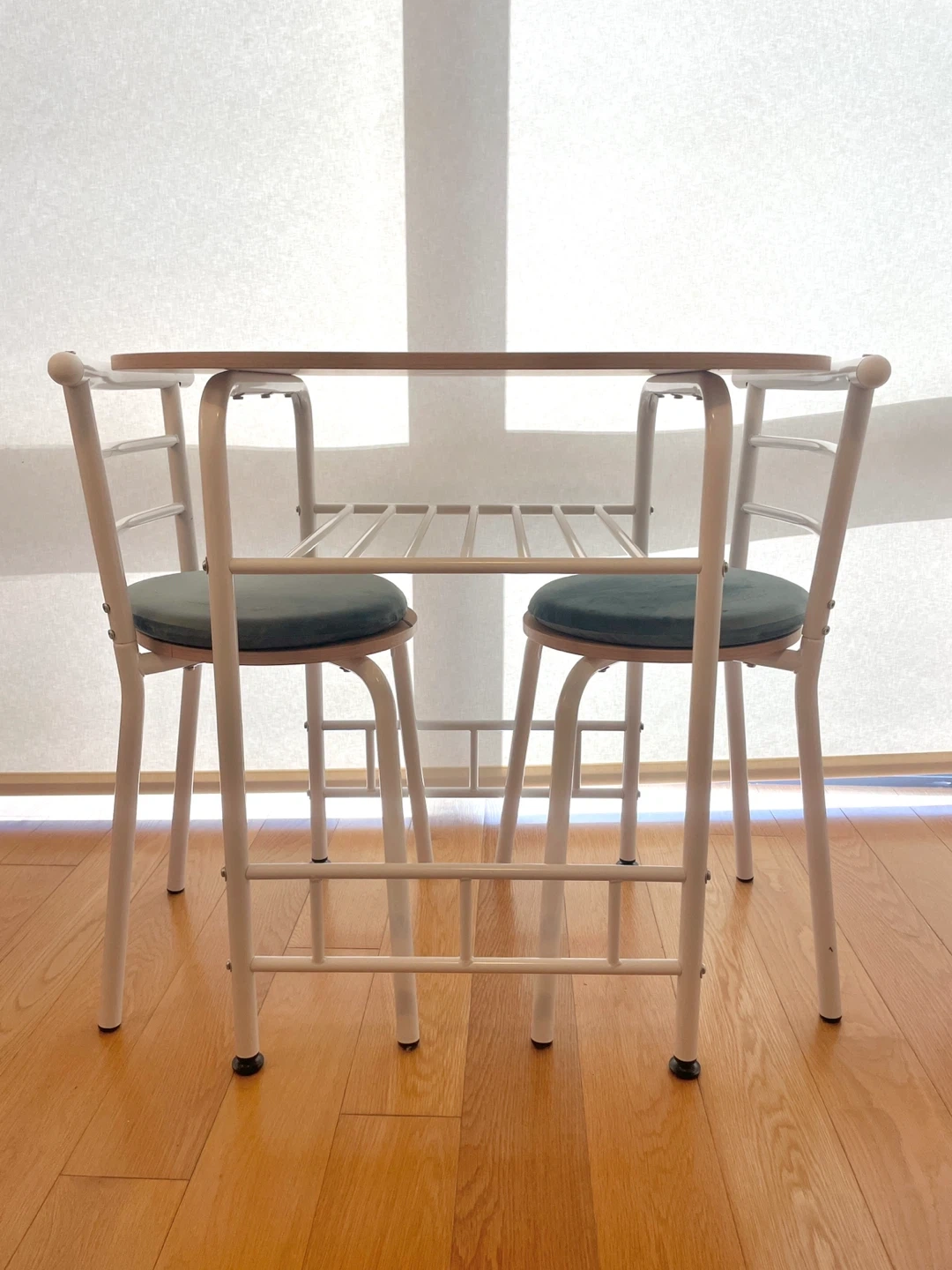 2-person dining set. Includes a storage shelf and 2 matching seat cushions. White and beige wood finishings. Fully assembled.