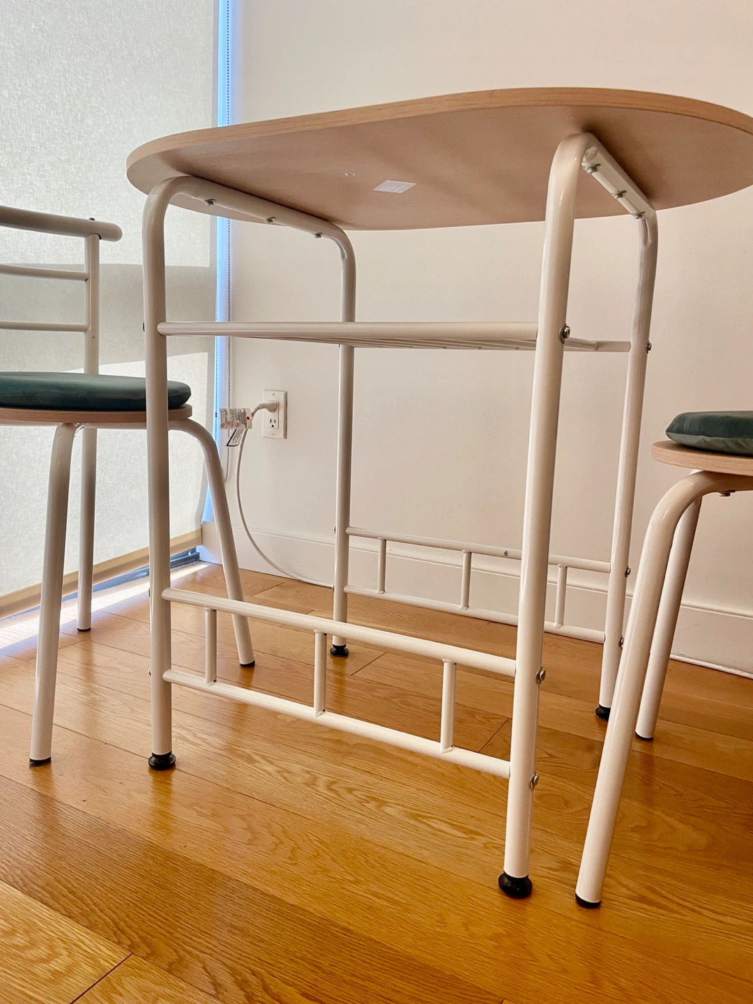 2-person dining set. Includes a storage shelf and 2 matching seat cushions. White and beige wood finishings. Fully assembled.