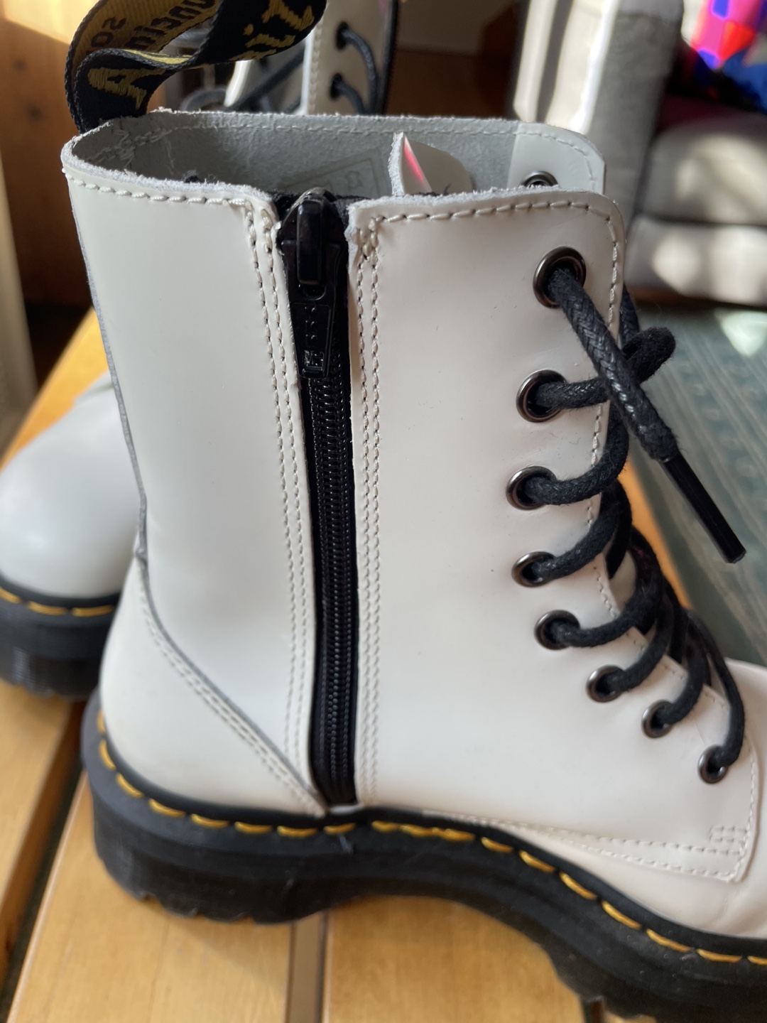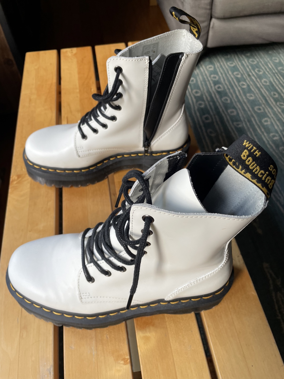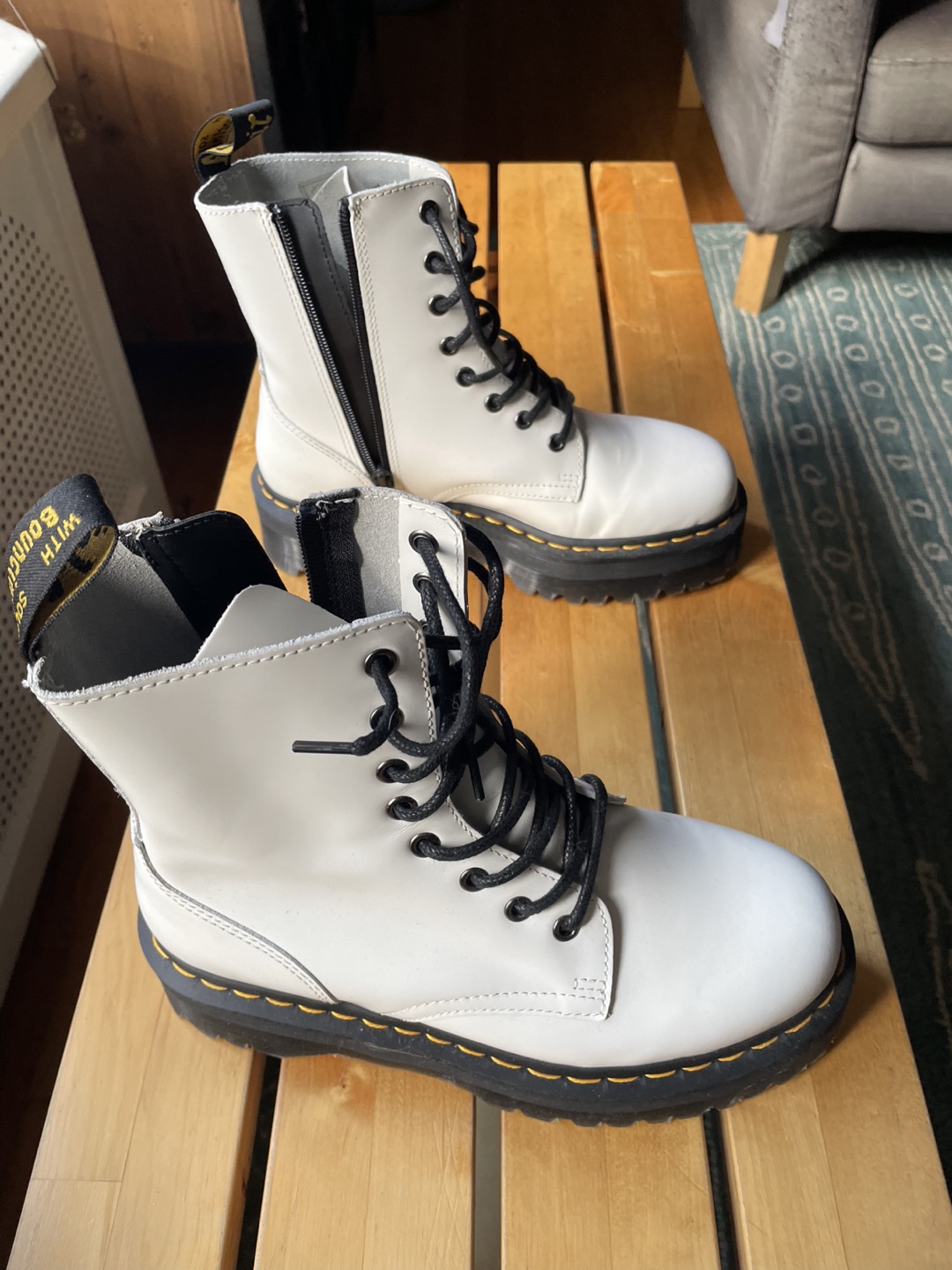 Selling a pair of Dr. Martens Jadon boots in white. These are a women's US size 9 / UK size 7. They have a platform sole and the classic Dr. Martens look with black laces and a side zipper. Never worn, these are like new.