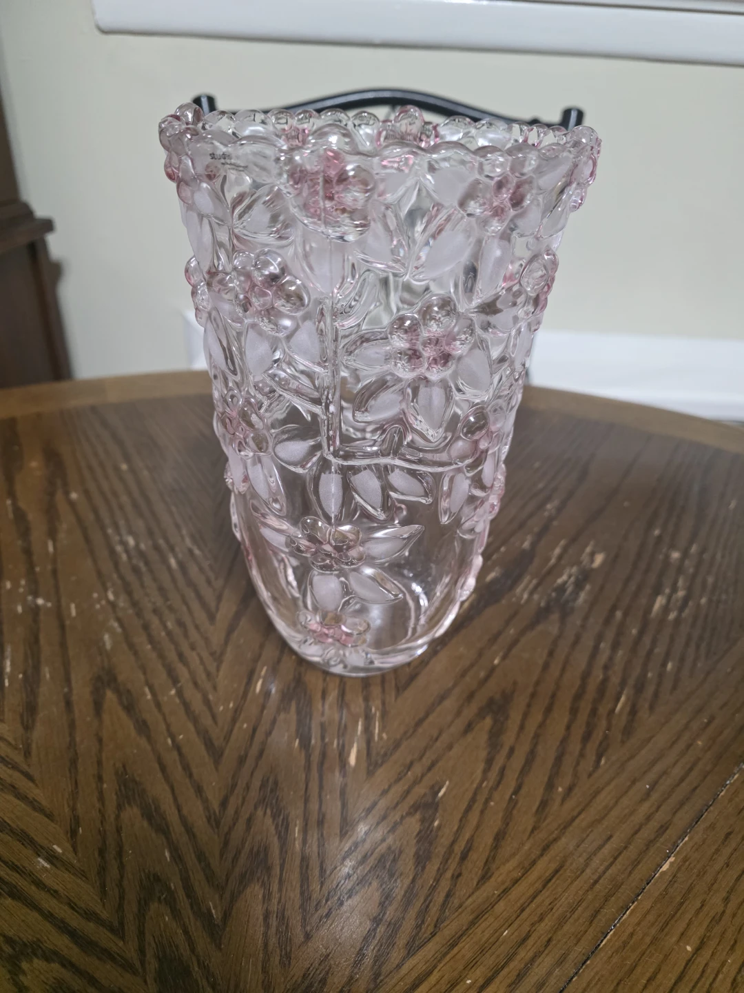 This clear glass vase features an embossed floral design with delicate pink accents. It's perfect for displaying flowers or as a decorative accent piece. Glass material.