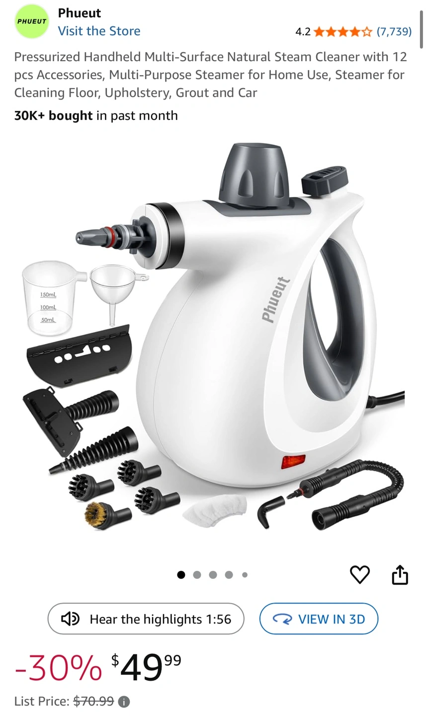Lightly used (only twice) for clothes and sofa. Comes with 12 accessories, making it a versatile, all-purpose steamer for your home — great for cleaning fabric, upholstery, and more.