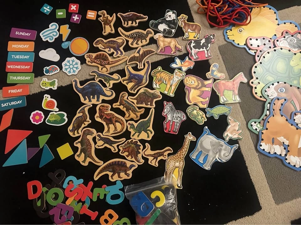 Tons of magnets! Days of the week, weather, shapes, numbers letters, dinosaurs and Melissa and Doug animals. Also lace cards! Pick up on 45th and 9th ave.