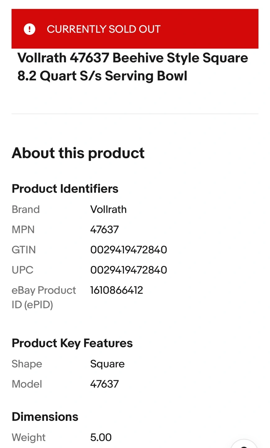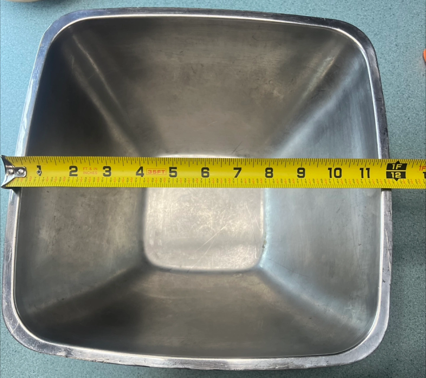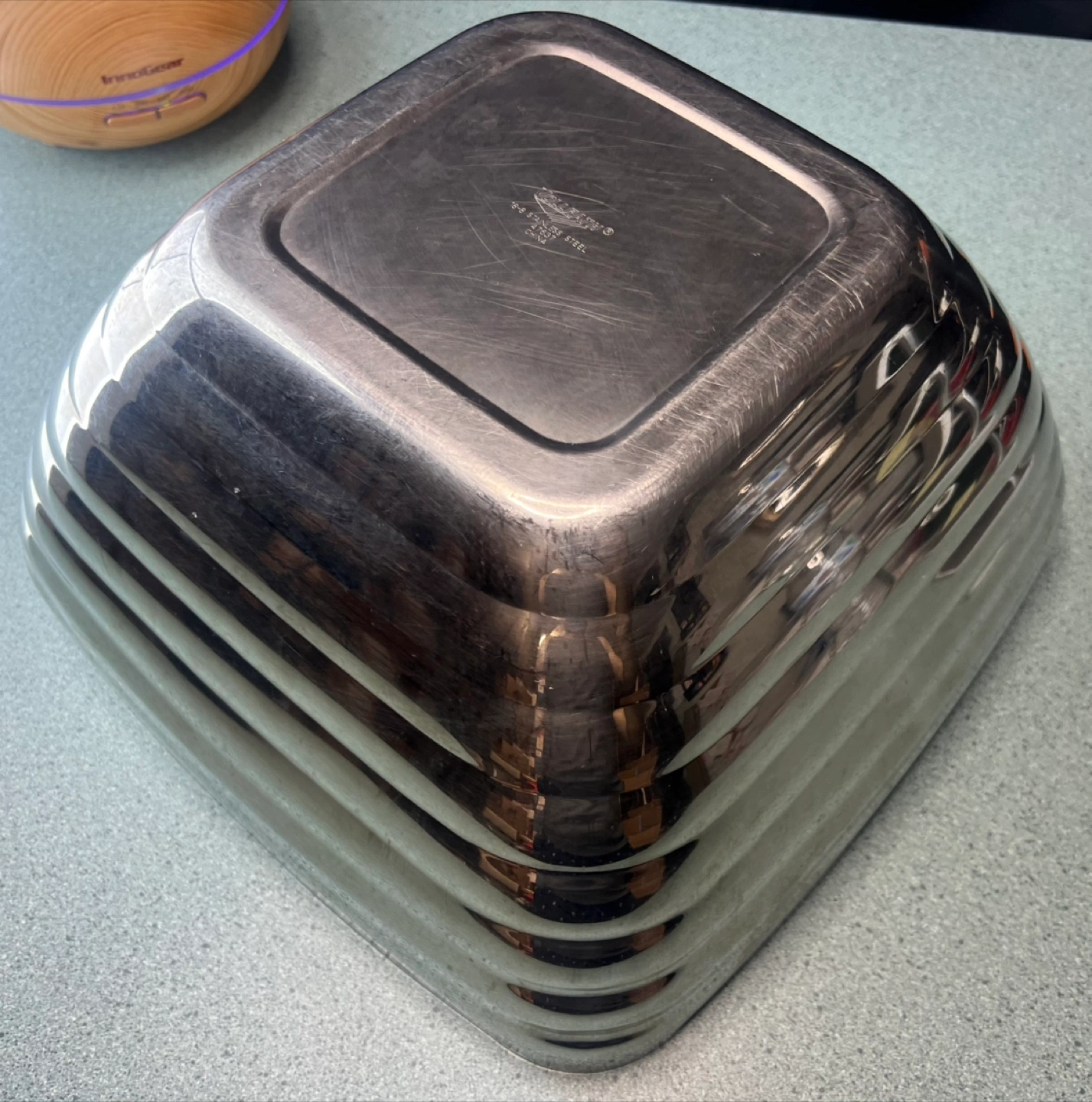Large stainless steel bowl. Square shape with ribbed sides. Measures approximately 6 inches high and 12 inches wide. I have several available at $20 each.