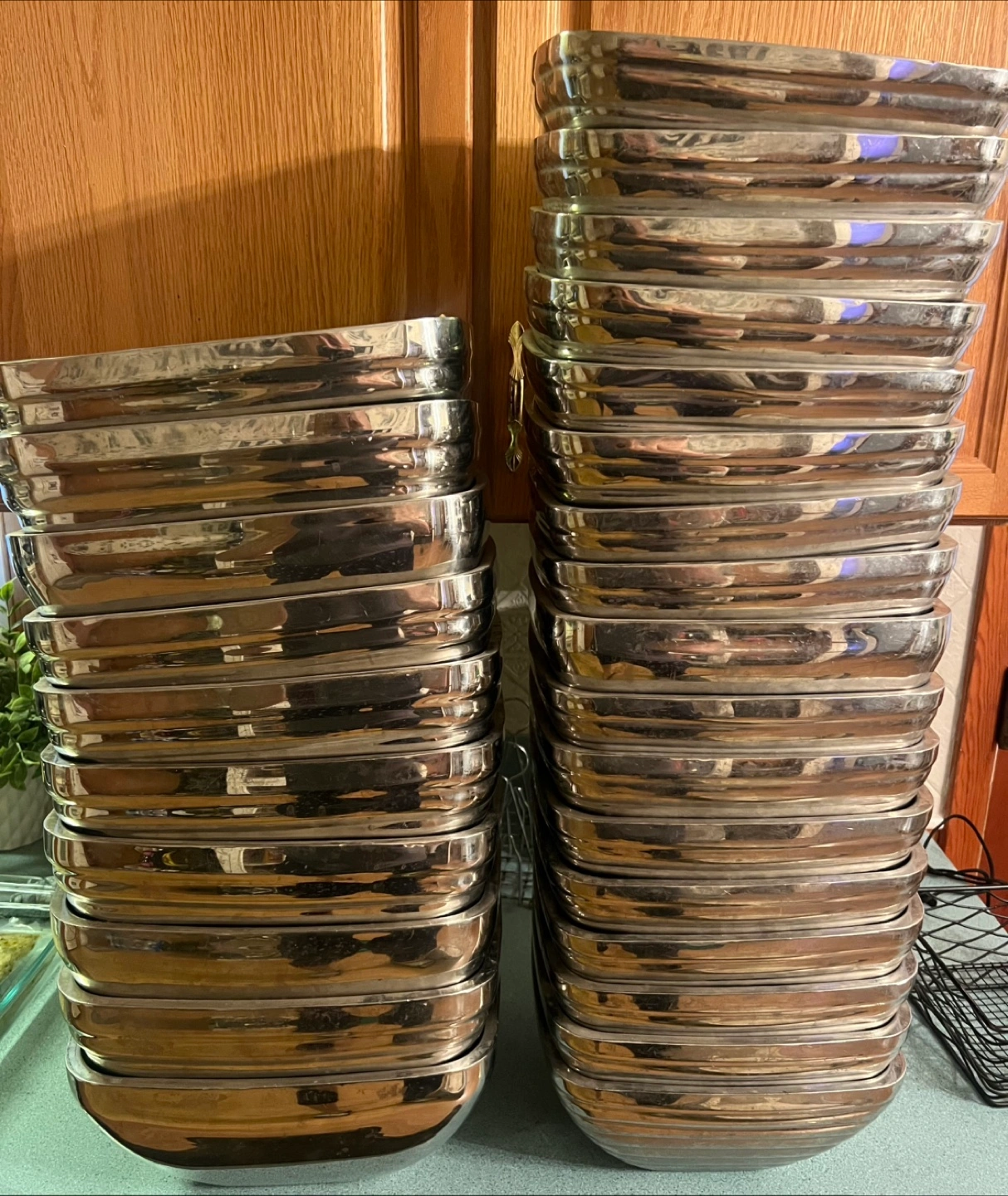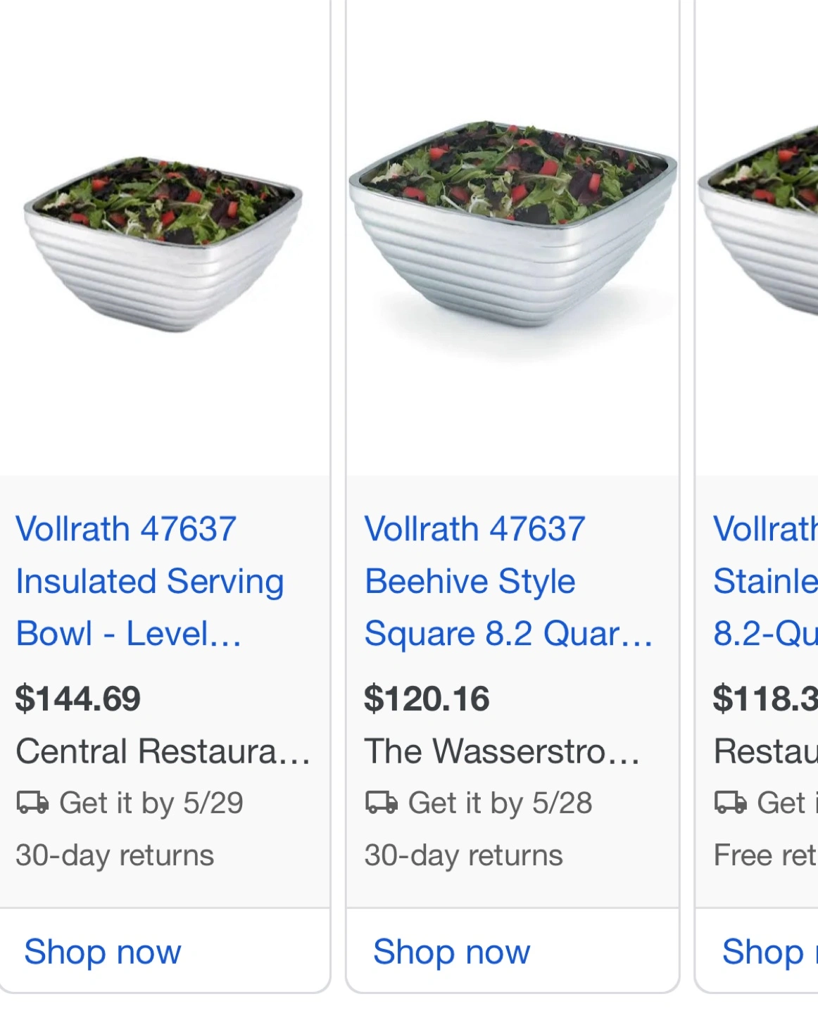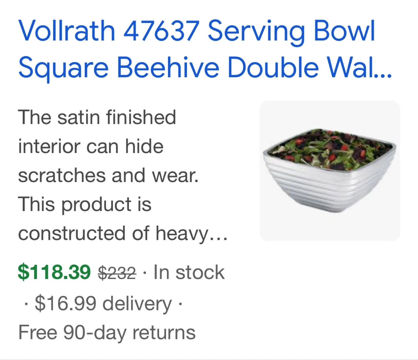 Large stainless steel bowl. Square shape with ribbed sides. Measures approximately 6 inches high and 12 inches wide. I have several available at $20 each.