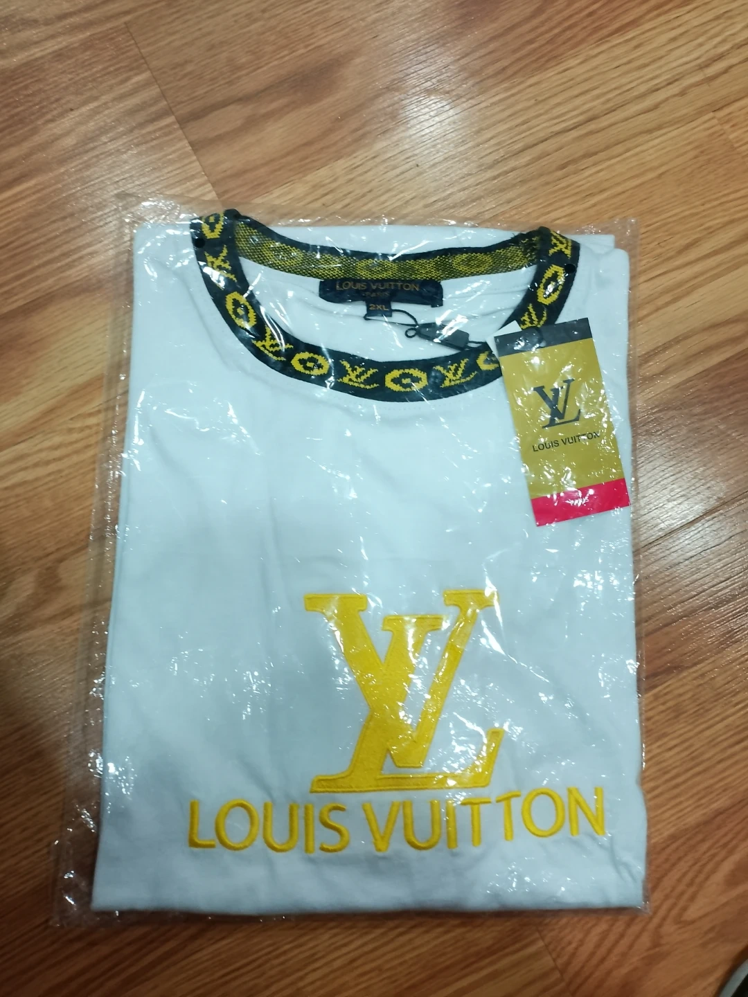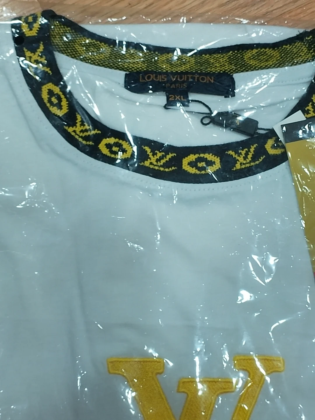 White Louis Vuitton t-shirt with yellow LV logo and collar detail. Size 2XL. Cotton blend material.
