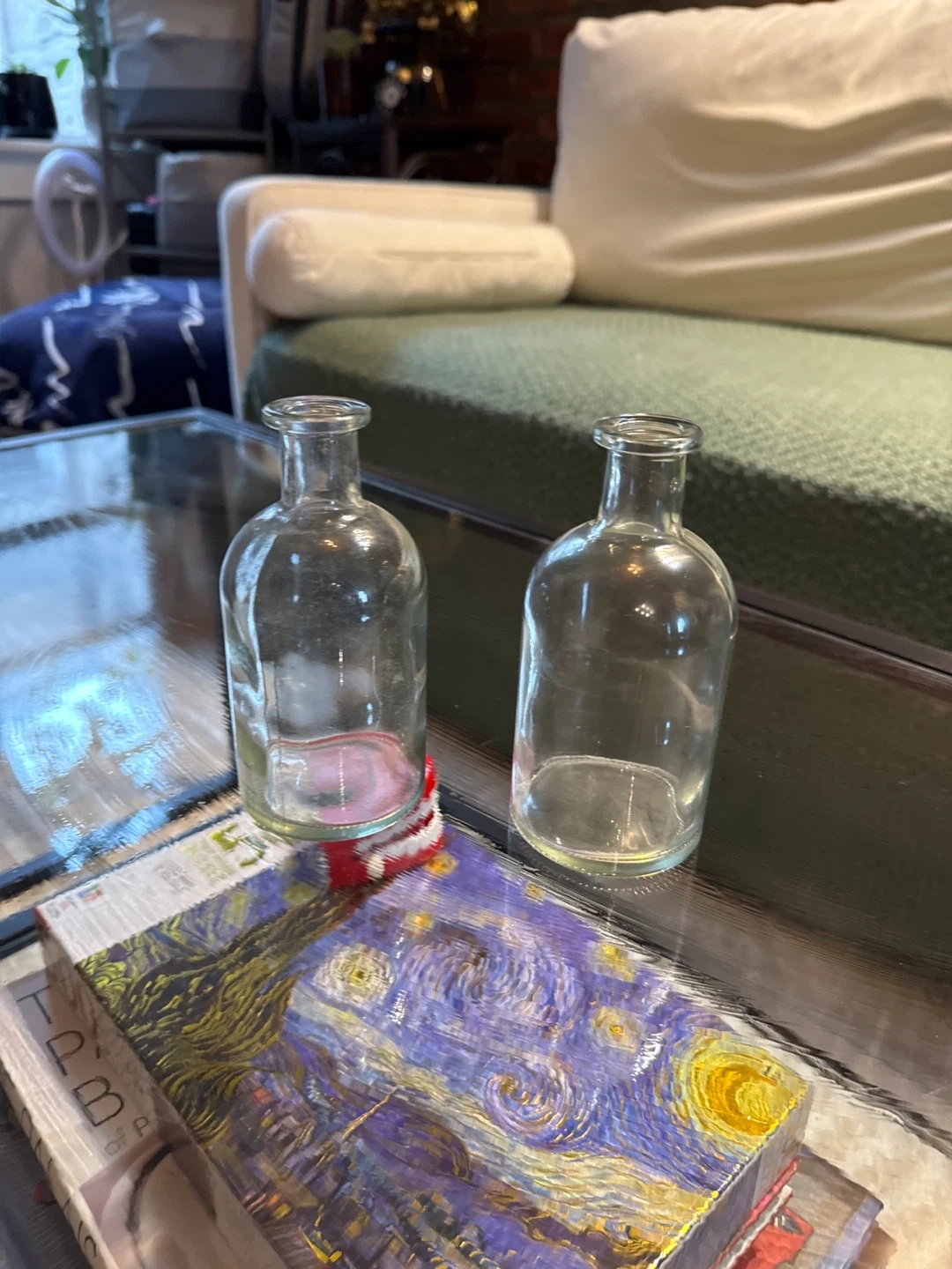 Here's a set of two small clear glass vases. They're perfect for displaying single flowers or small dried arrangements. Made of glass.