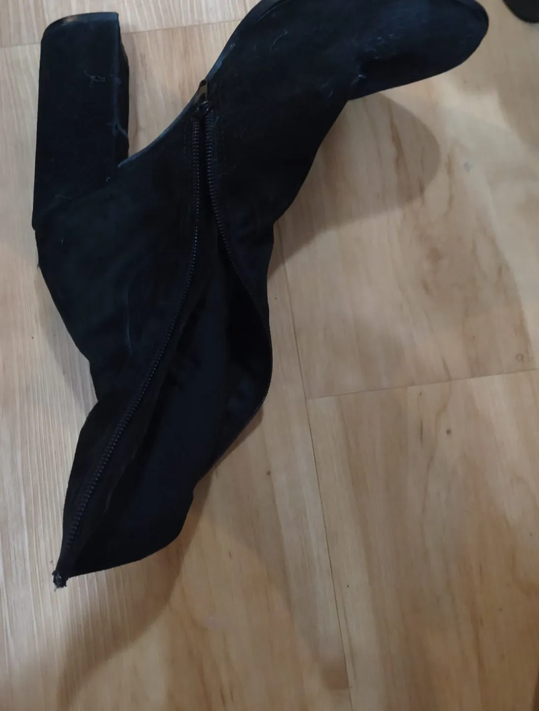 These are black suede boots. They have a side zipper closure for easy on and off. The heel is a block style.