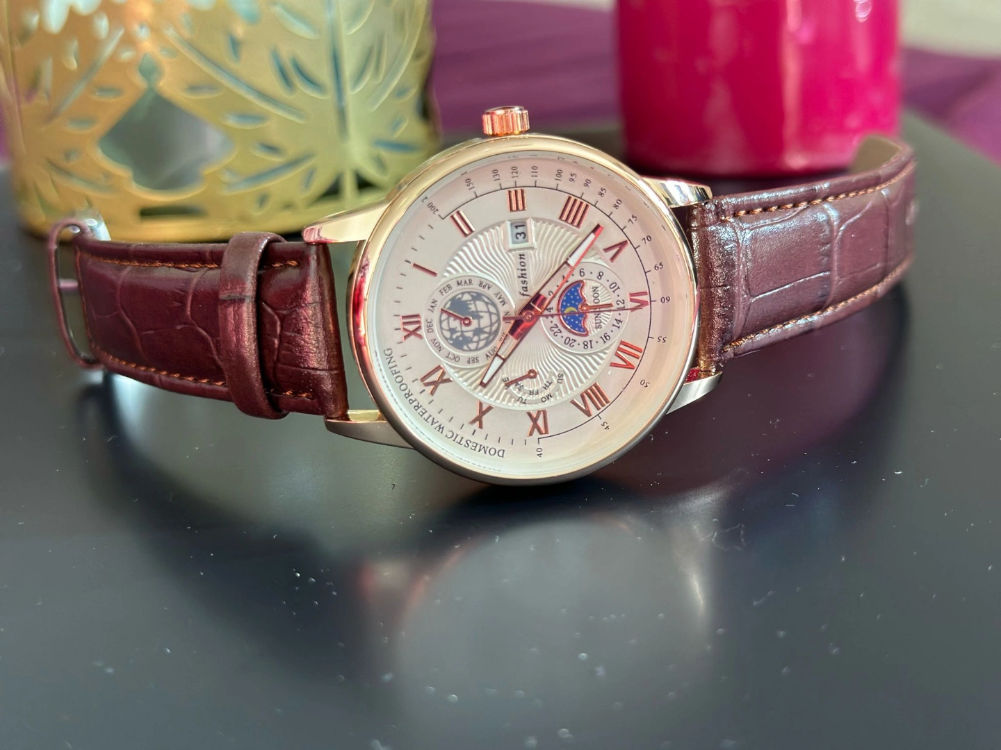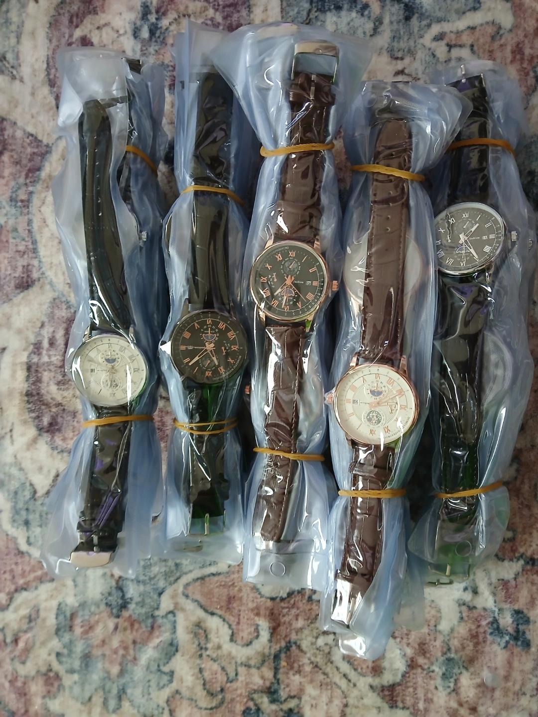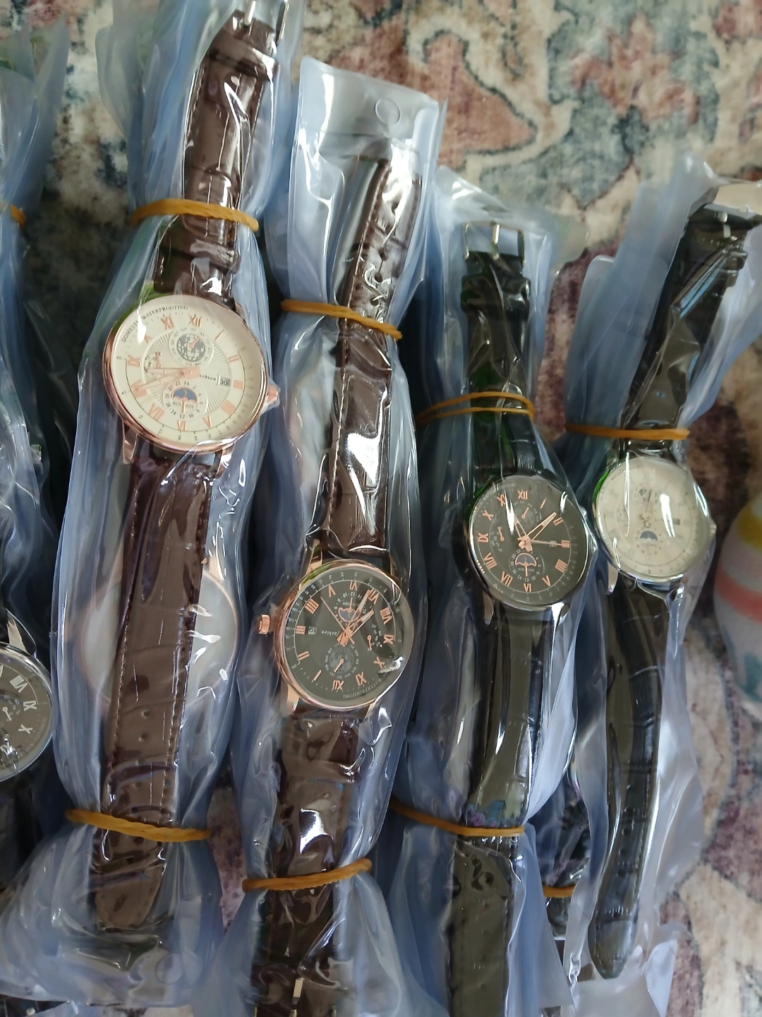 Multiple men's wristwatches. Brown leather band. Rose gold colored accents. Moon phase complication. Individually packaged. Bulk purchase. 450 pieces