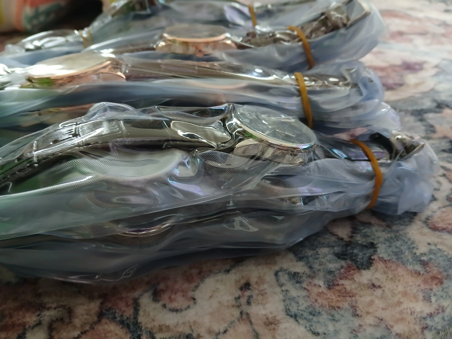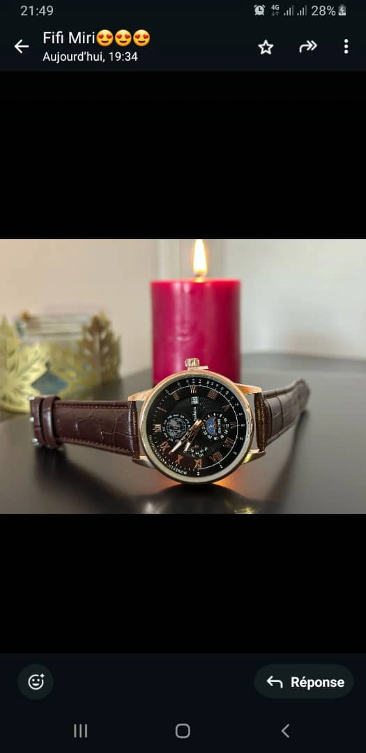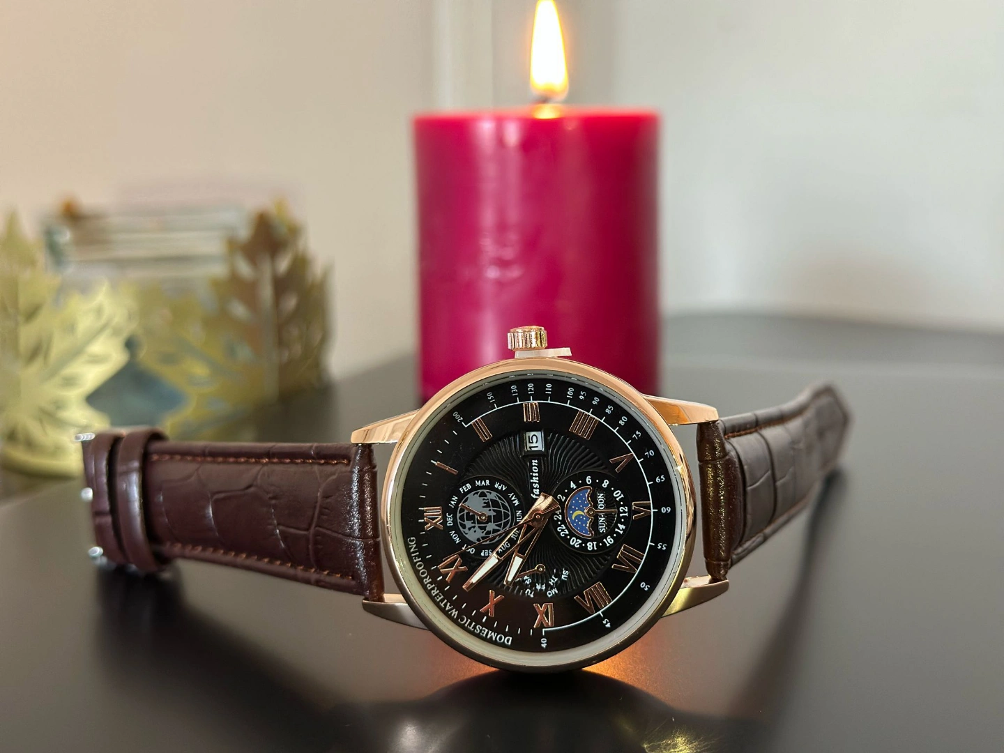 Multiple men's wristwatches. Brown leather band. Rose gold colored accents. Moon phase complication. Individually packaged. Bulk purchase. 450 pieces