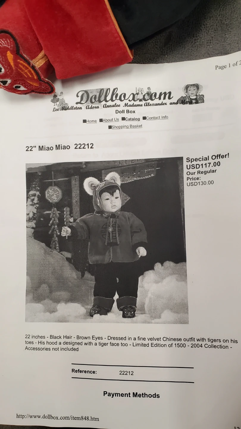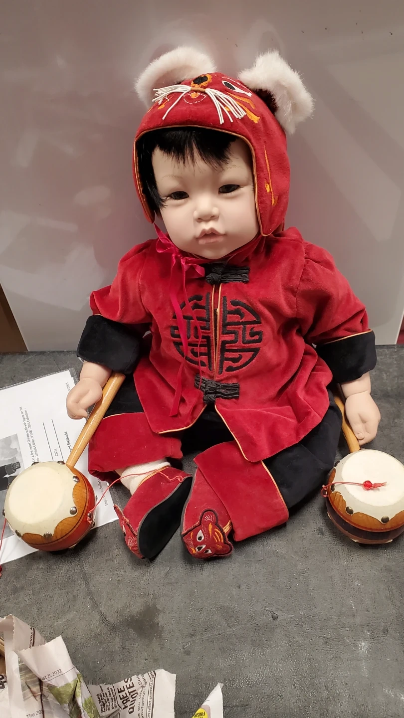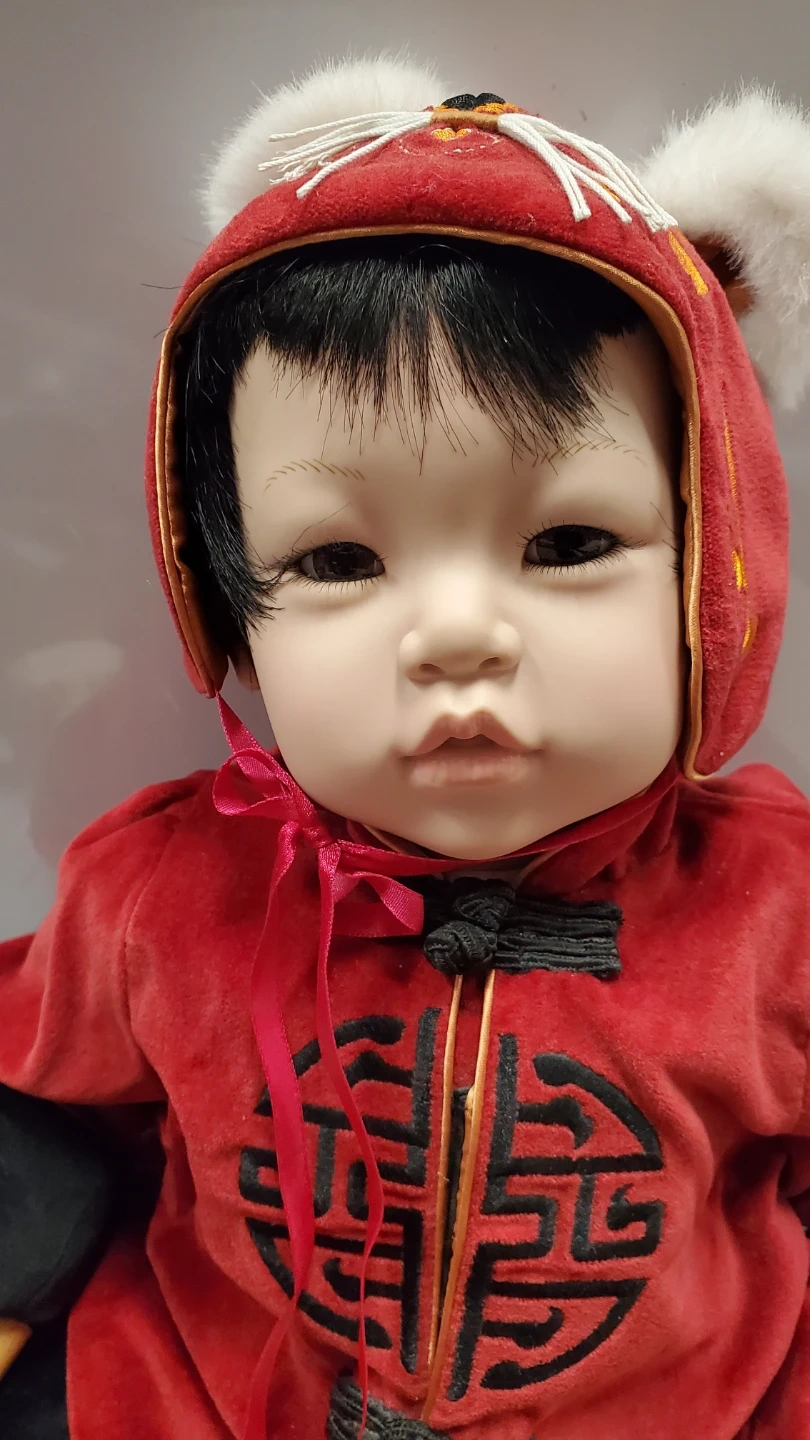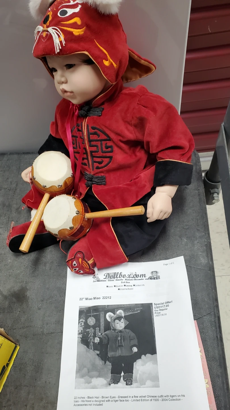 This 22-inch Miao Miao doll is dressed in a fine velvet Chinese outfit with tigers on its hat and shoes. It features black hair and brown eyes. This collectible doll was a limited edition from 2004. Accessories like the drums are included. The doll is porcelain and cloth limited edition.