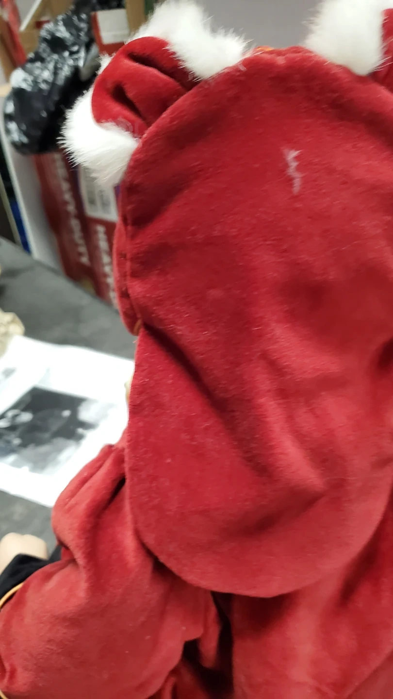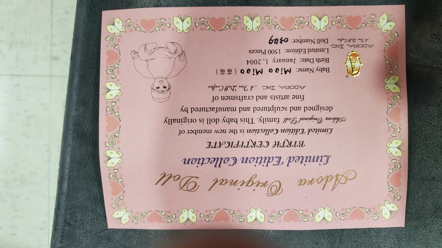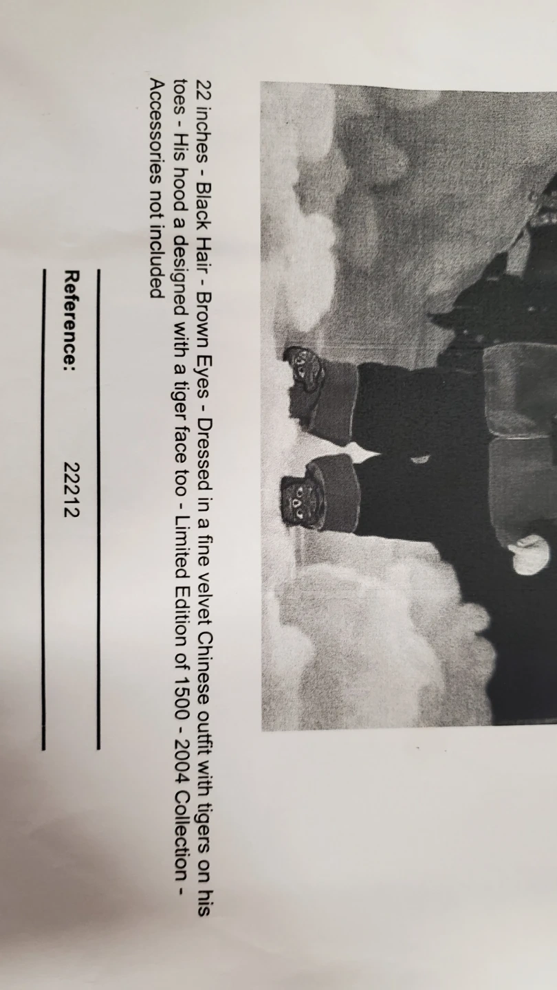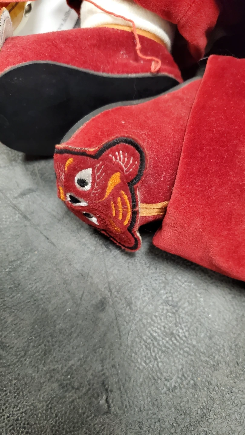 This 22-inch Miao Miao doll is dressed in a fine velvet Chinese outfit with tigers on its hat and shoes. It features black hair and brown eyes. This collectible doll was a limited edition from 2004. Accessories like the drums are included. The doll is porcelain and cloth limited edition.