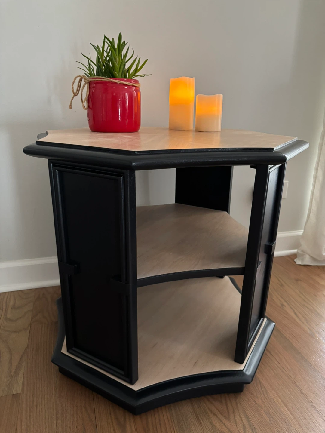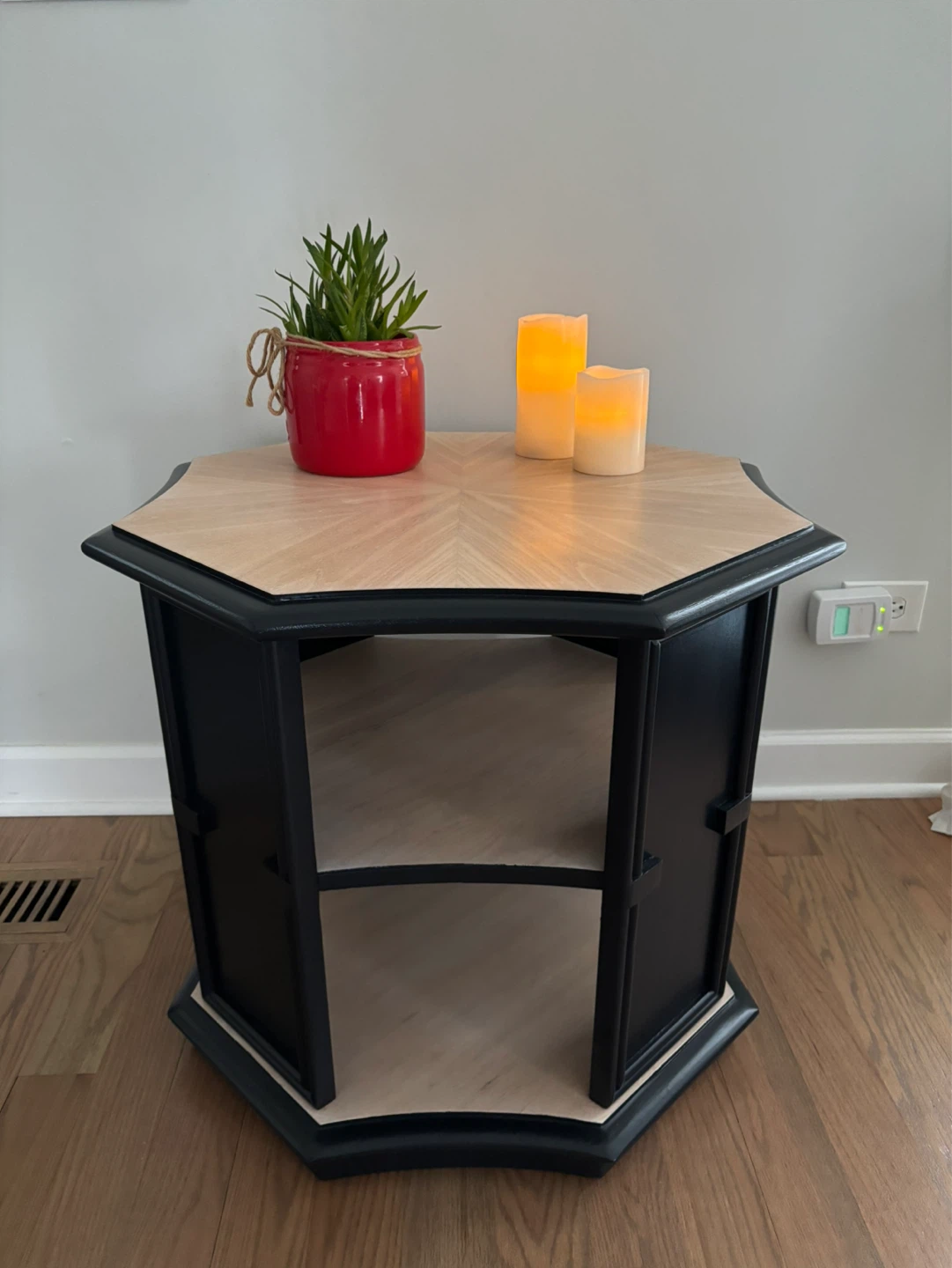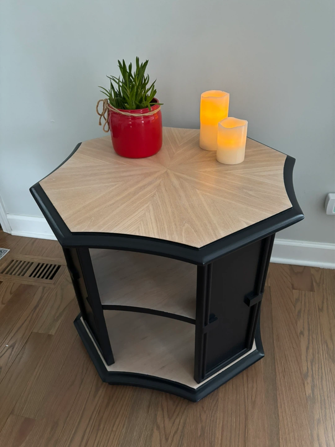 Beautiful octagonal side/end table with a striking geometric design and contrasting finishes. The top features oak veneer stained lightly in white, laid in a radial pattern, while the base is painted black (Sherwin Williams “Black of Night” color) with an open shelf for storage or display.