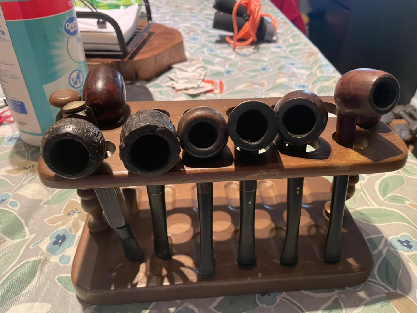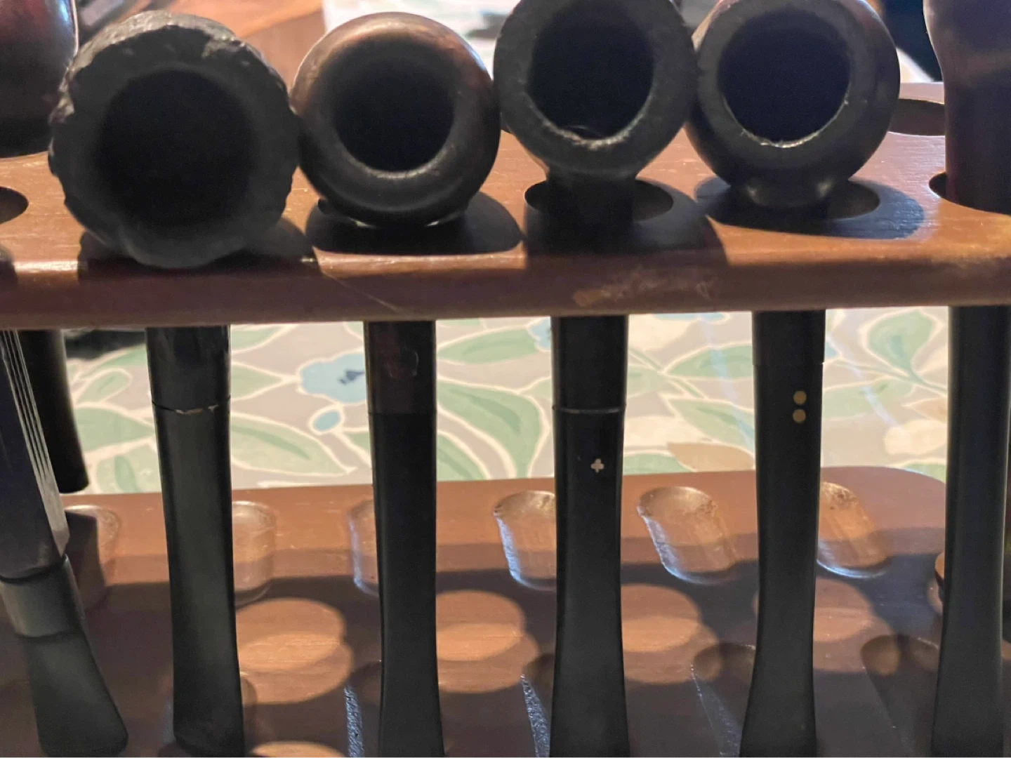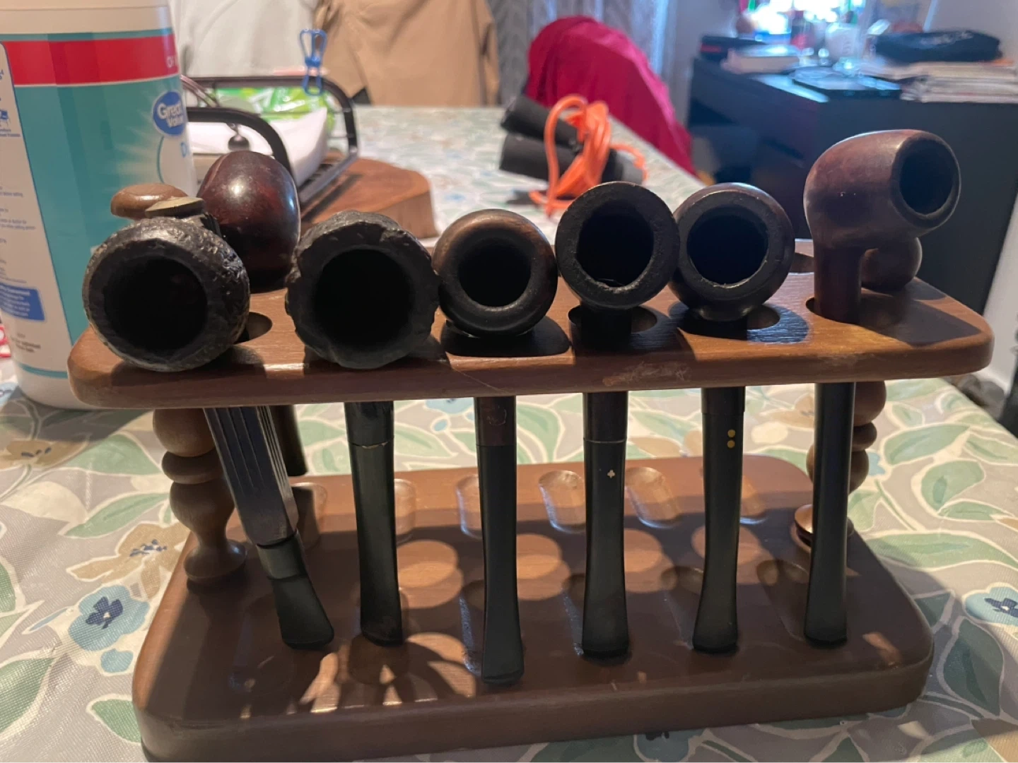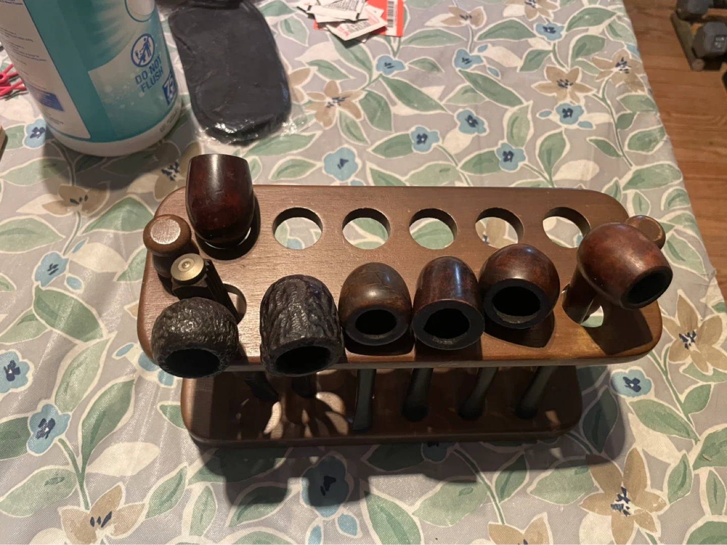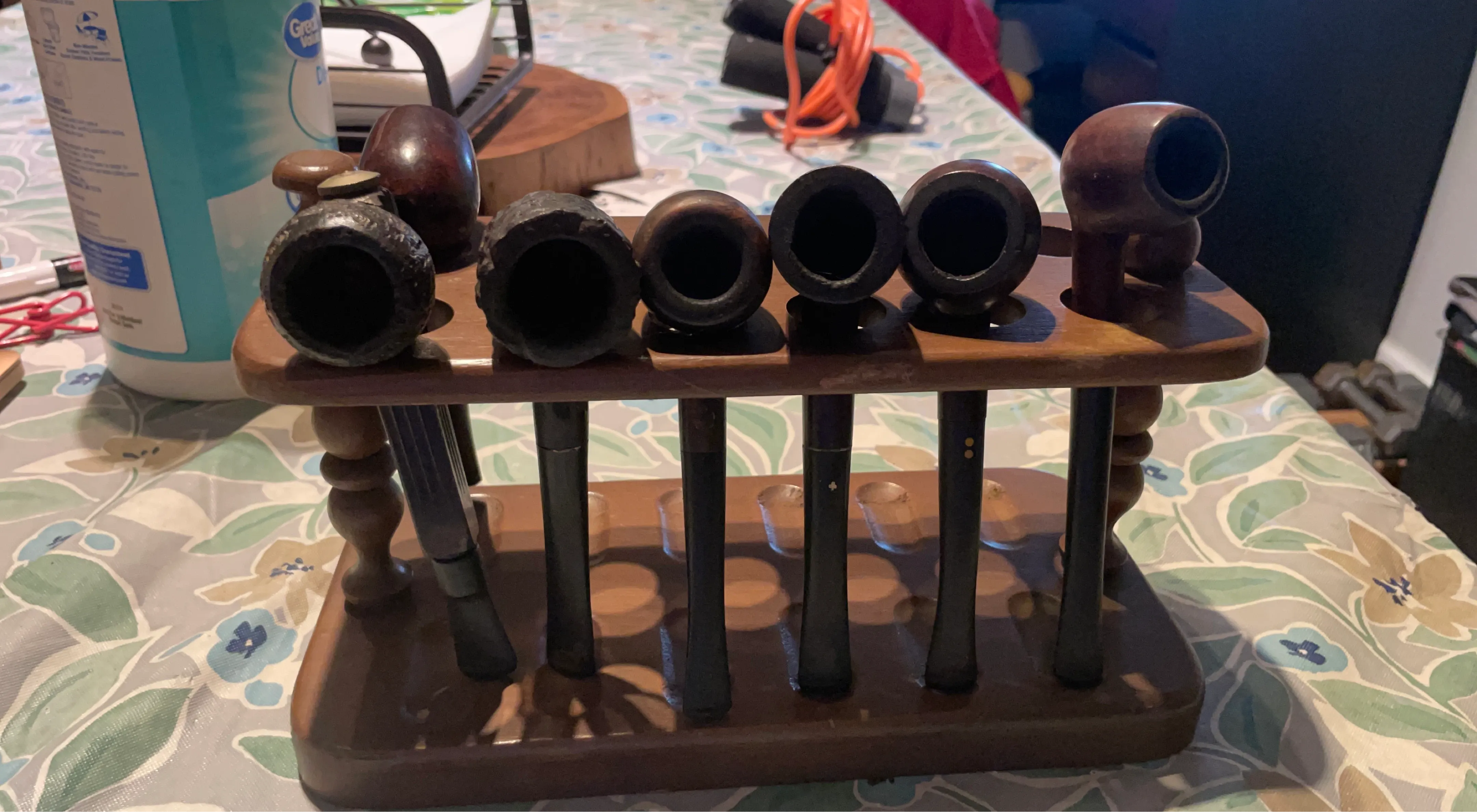 A wooden stand holding five pipes. Pipes are various shapes and dark colors. Stand is made of wood with a smooth finish. Perfect for organizing and displaying your pipes!