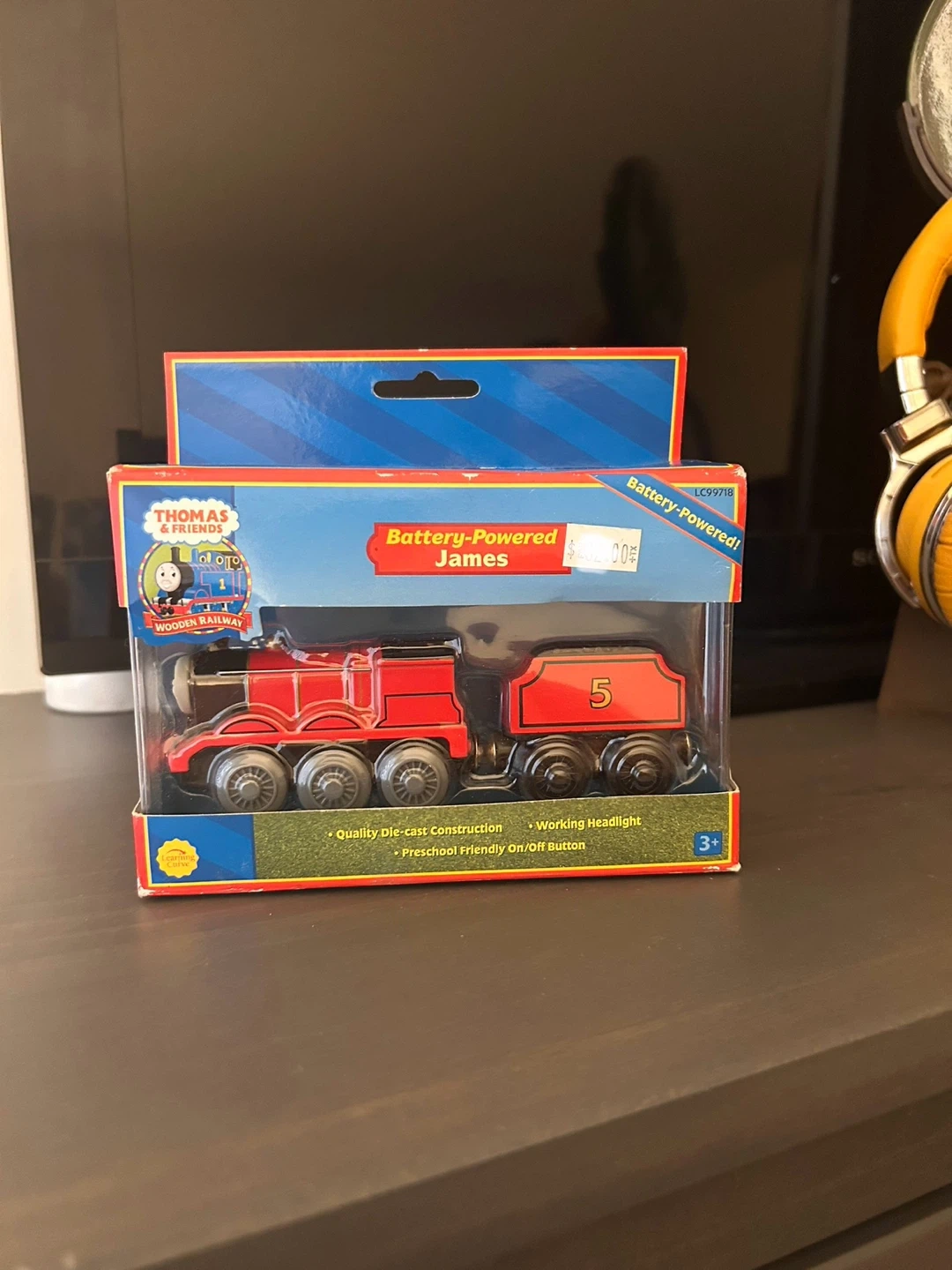Selling a brand new, in-box Thomas & Friends Battery-Powered James Wooden Railway train! It features quality die-cast construction and a working headlight. It's preschool friendly with an on/off button, and is recommended for ages 3+