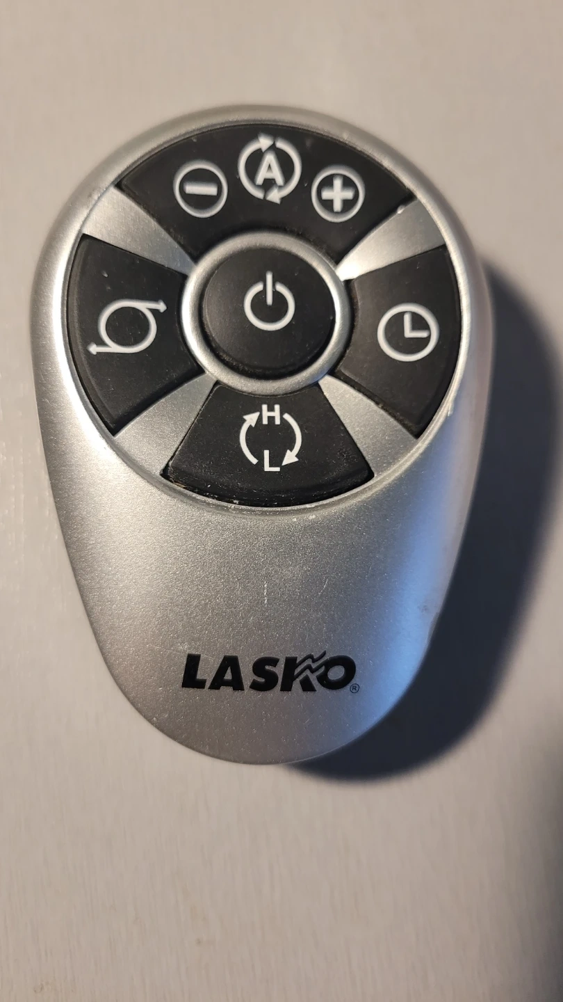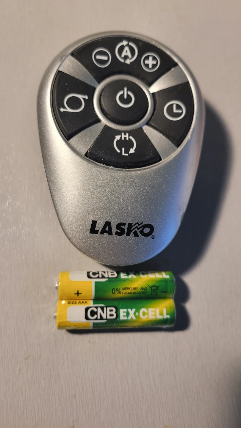 This is a Lasko remote control. It comes with two AAA batteries. The remote features power, timer, speed, and oscillation controls.