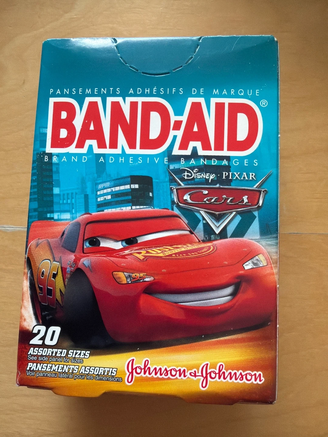Band-Aid brand adhesive bandages featuring Disney Pixar Cars characters. Includes 20 assorted sizes for different needs. Johnson & Johnson product. Not opened